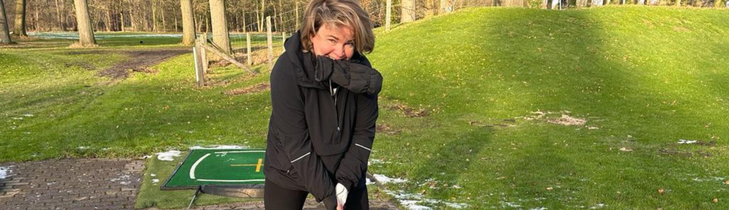In het open veld staat een vrouw of drie ballen te slaan met muts op, sjaal om en trainingsbroek aan. Heerlijk, denk ik. Roy en ik maken de mat ijsvrij, voor zover dat met de golfschoenen gaat. Een van de vrouwen ziet ons worstelen en roept: “Joe! Wij zijn straks weg, dan kunnen jullie beter op onze plekken staan. Het zonnetje schijnt hier tenminste en de mat is schoon.” Hoe aardig, denk ik.