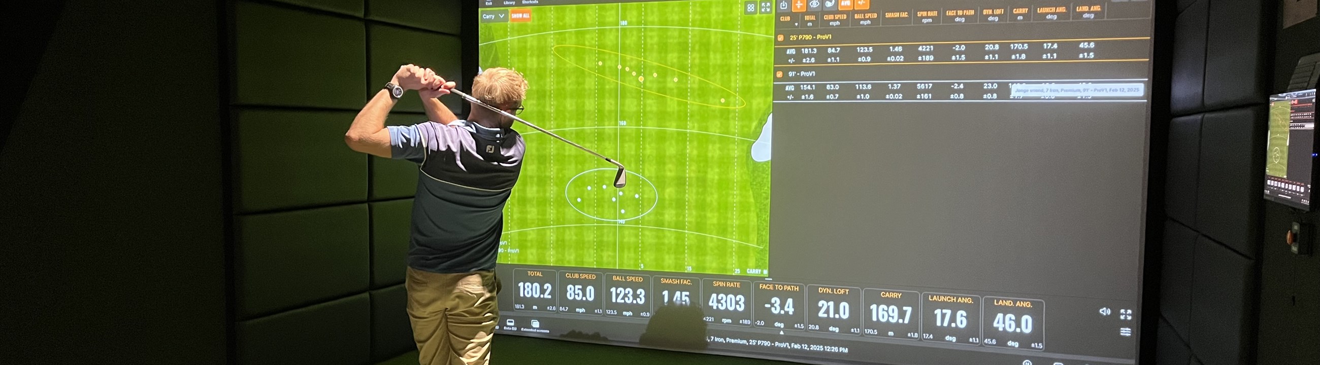 Wat liet de data zien? In de onderstaande tabel zijn de belangrijkste testgegevens weergegeven. Het verschil in afstand en spin is aanzienlijk, maar de landingshoek is nagenoeg gelijk. In de tweede afbeelding is ook de spreiding te zien. De cirkel die getrokken is rond de ballen met de oude ijzer-7 is kleiner dan de cirkel van de ballen geslagen met de ijzer-7 uit 2025.