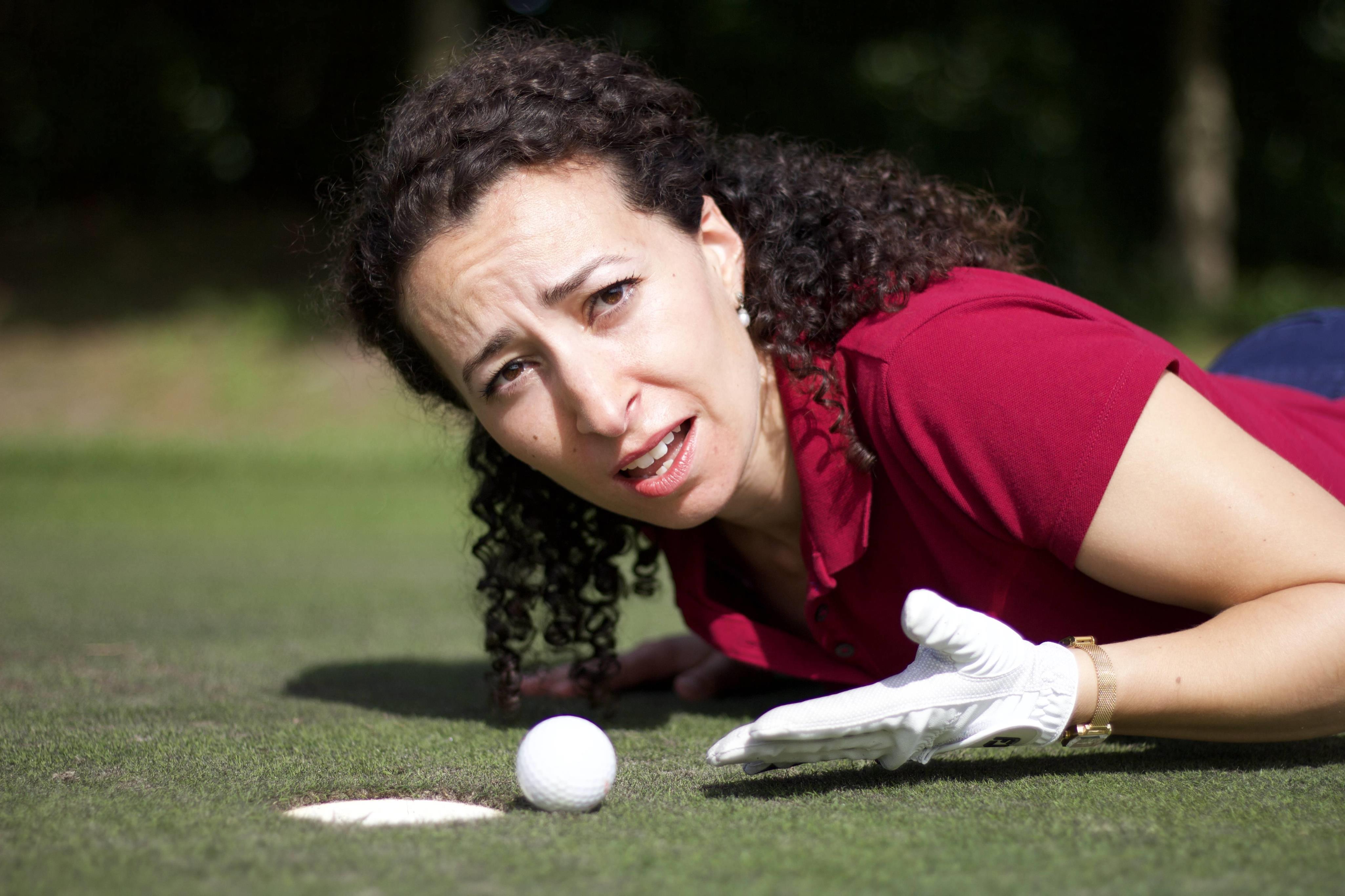 Sjongejonge, wat een gedoe was dit eigenlijk. Ik pakte de bal op en liep snel door naar de tweede tee, dan konden die mannen tenminste beginnen. Maar bij de tweede tee stonden nog steeds die donderse vrouwen. Tegen de tijd dat zij eindelijk weg waren, stonden de twee mannen alweer glimlachend op me te wachten. Zodat ze rustig konden zien hoe ik de bal in de berm sloeg. En weer in de bunker. En in de vijver, twee keer. Vol zelfverachting pakte ik m’n tas en vluchtte de baan af. De volgende keer moet ik toch maar samen met m’n man komen.