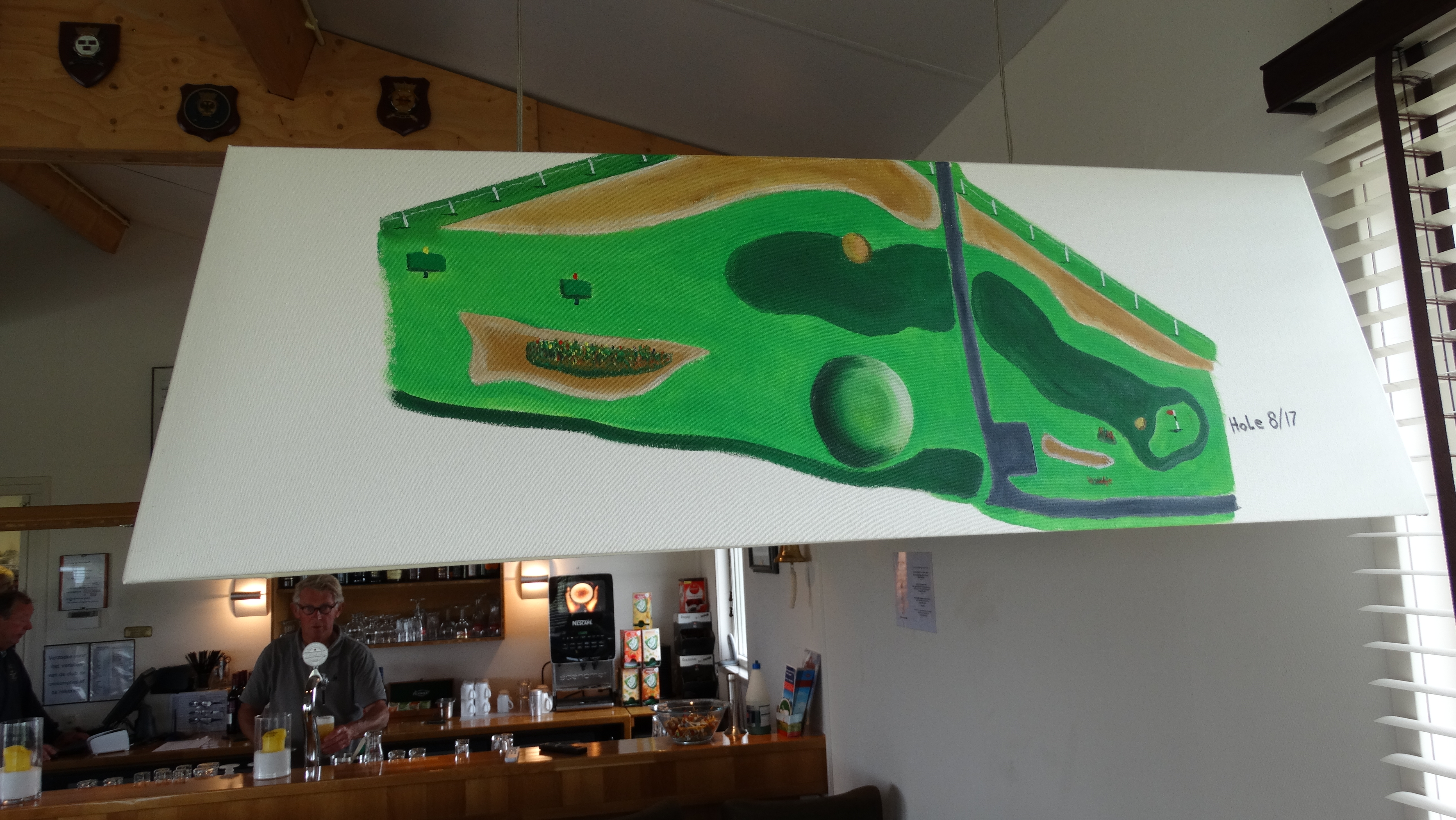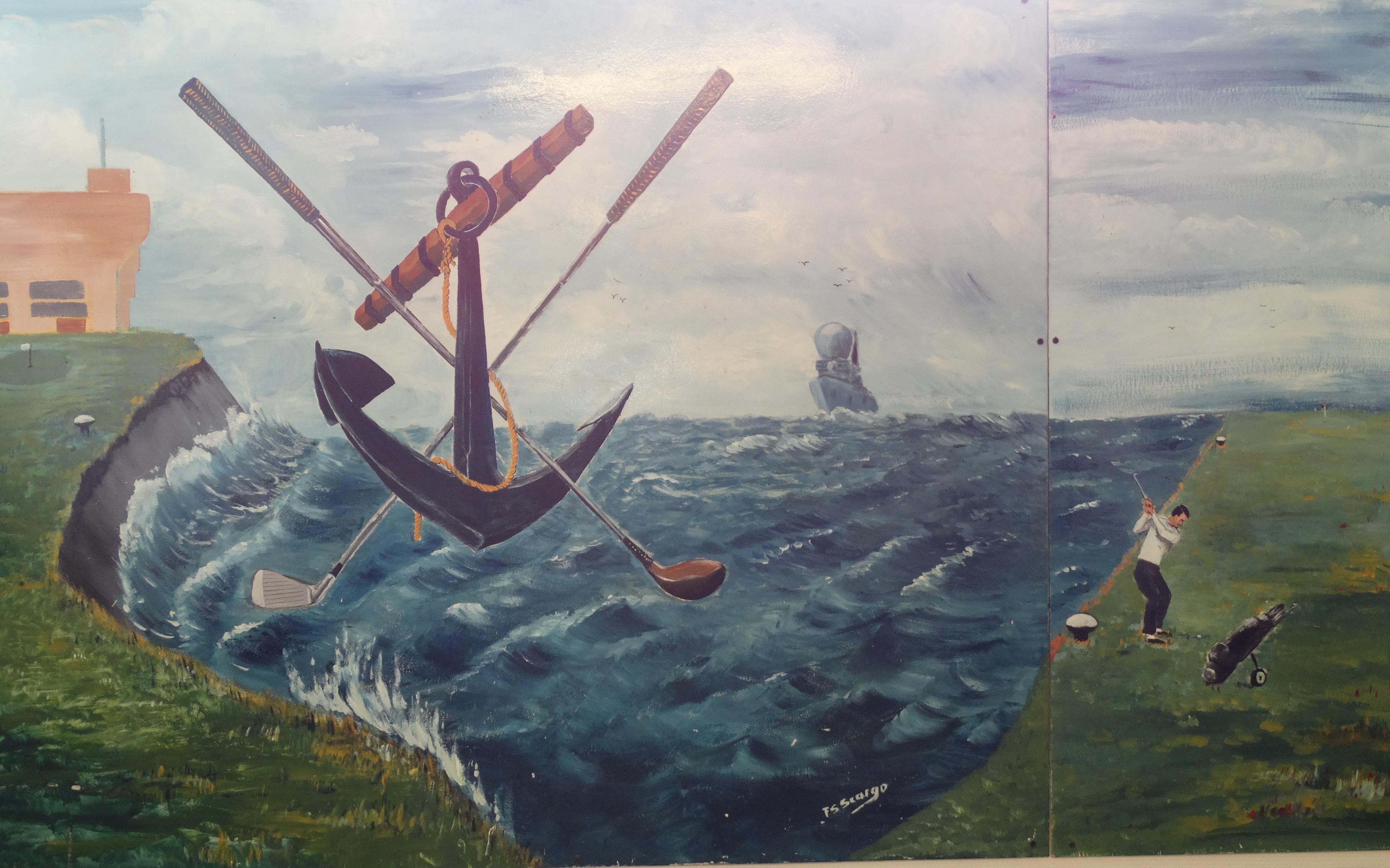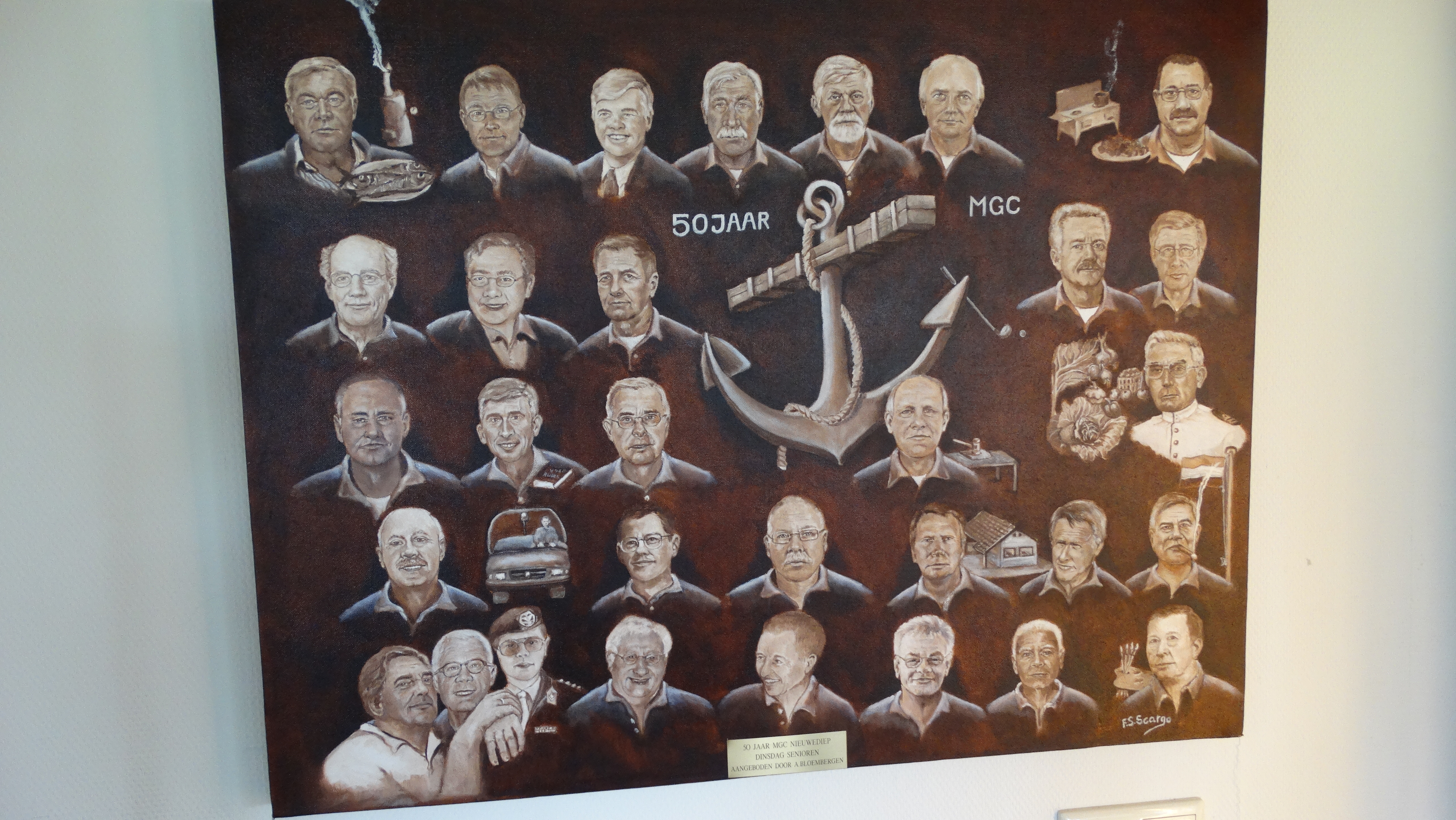 Een mooie golfbaan dus, waar genoeg is te zien. Maar wat een bezoek extra leuk maakt, is de gastvrijheid en vriendelijkheid van de leden van de Marine Golfclub. We speelden in een flight met Nieuwediep-lid Simon (Siem) Scargo, die later op de dag de winnaar bleek van de achttien-holes uitwisselingswedstrijd (de senioren van de Marine Golfclub spelen achttien holes, geen negen zoals veel niet-militairen…). Scargo, nu gepensioneerd, was al in zijn dienstjaren bij de Koninklijke Marine een getalenteerde schilder. In het clubhuis hangen veel werken van hem. Onder meer een schilderij van zijn seniorengroep, maar ook van de koning en koningin – de marine is immers koninklijk. Op elke lampenkap in het clubhuis heeft FS Scargo – zijn naam als schilder (zie fs.scargo.eu) – een hole geschilderd.
