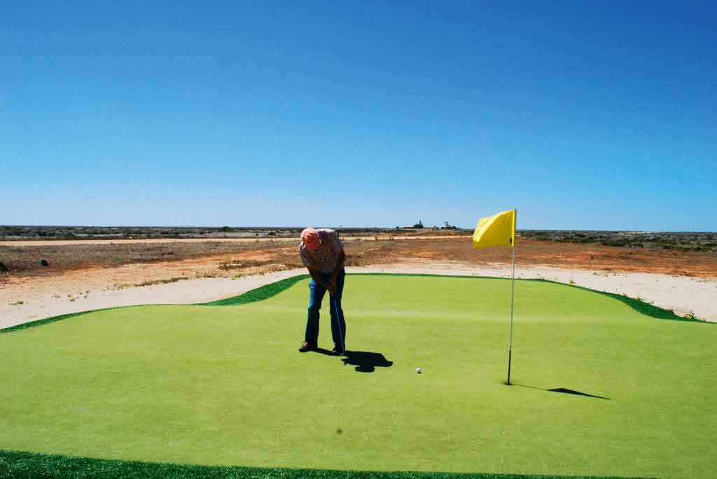 Net als Aruba GC (boven) is deze 18-holes golfbaan in het Australische mijnstadje Coober Pedy grasloos. De greens op Cooper Pedy Opal Fields, 850 kilometer ten noorden van Adelaide, zijn een mengsel van zand en olie. Nadat je hebt afgeslagen van een kunstgras tee mag je slaan van een kunstgras matje; iedere bezoeker krijgt zo'n matje mee.