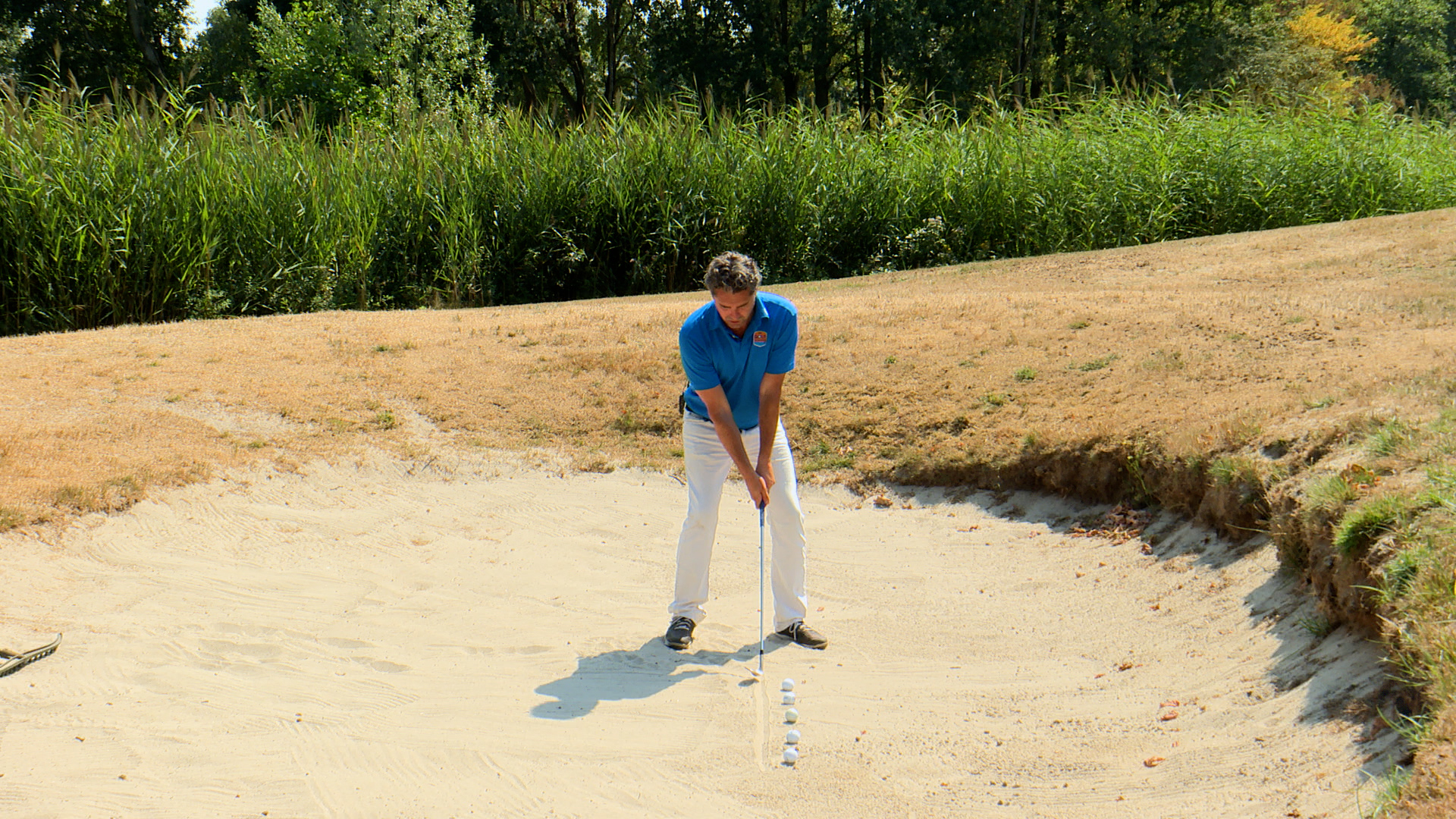 De houding die je al oefende, voer je nu uit met je sandwedge en bal.