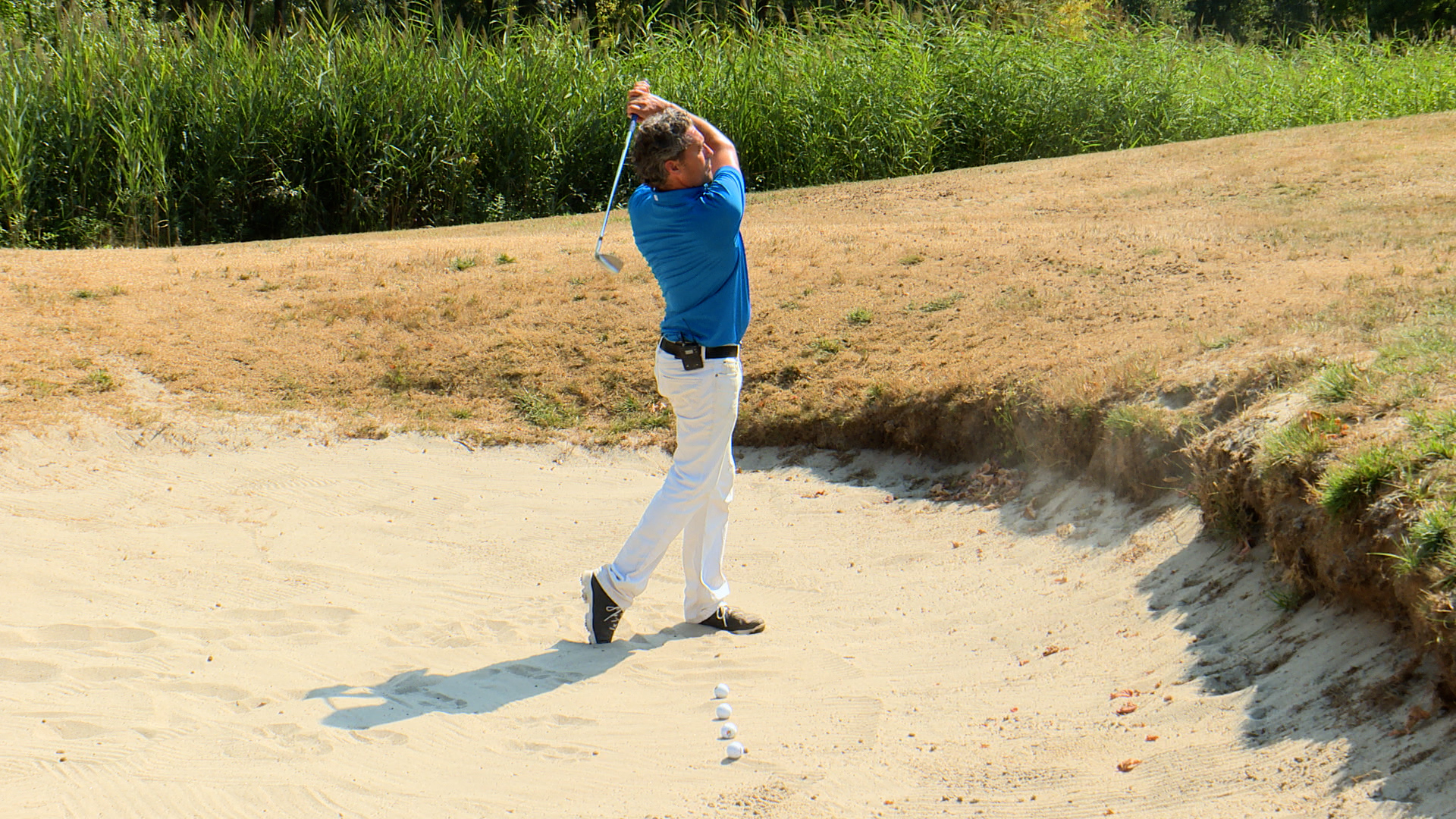 Geen paniek als je in de bunker ligt! Probeer altijd door te slaan en niet om de bal ‘eruit te lepelen’. De bunkerslag kun je goed oefenen door een plankje (brood- of snijplank) in de bunker te leggen. Leg er een hoopje zand op en daarop je bal. Het plankje zal je het gevoel geven dat je lekker door het zand heen kunt slaan. Probeer dat een paar keer. Als je het gevoel hebt dat je club door het zand beweegt en je doorzwaai goed is, haal je het plankje weg en doe je de oefening opnieuw. Misschien vind je het fijn om je gewicht iets op je linkerbeen te hebben. Hoeft niet, mag wel. Probeer voor jezelf uit te vinden of dat prettig is en zo ja, hoeveel gewicht op links fijn is voor je.