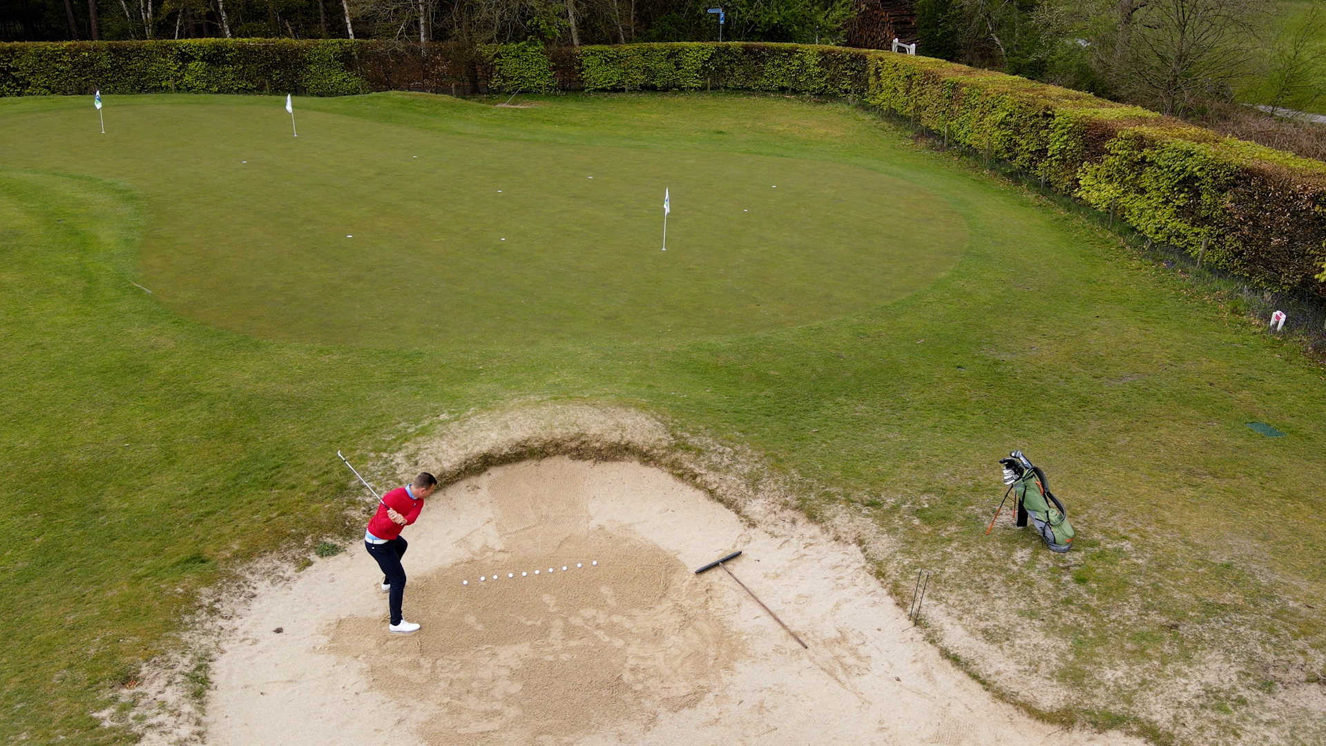 Je zoekt voor deze oefening een fairwaybunker; het liefst een oefenbunker om overlast op de baan te voorkomen of oefen op een tijdstip dat het niet druk is in de baan. Leg je bal op het zand en sla met een 9 de bal uit de bunker. Herhaal deze oefening 10 keer met dezelfde club.