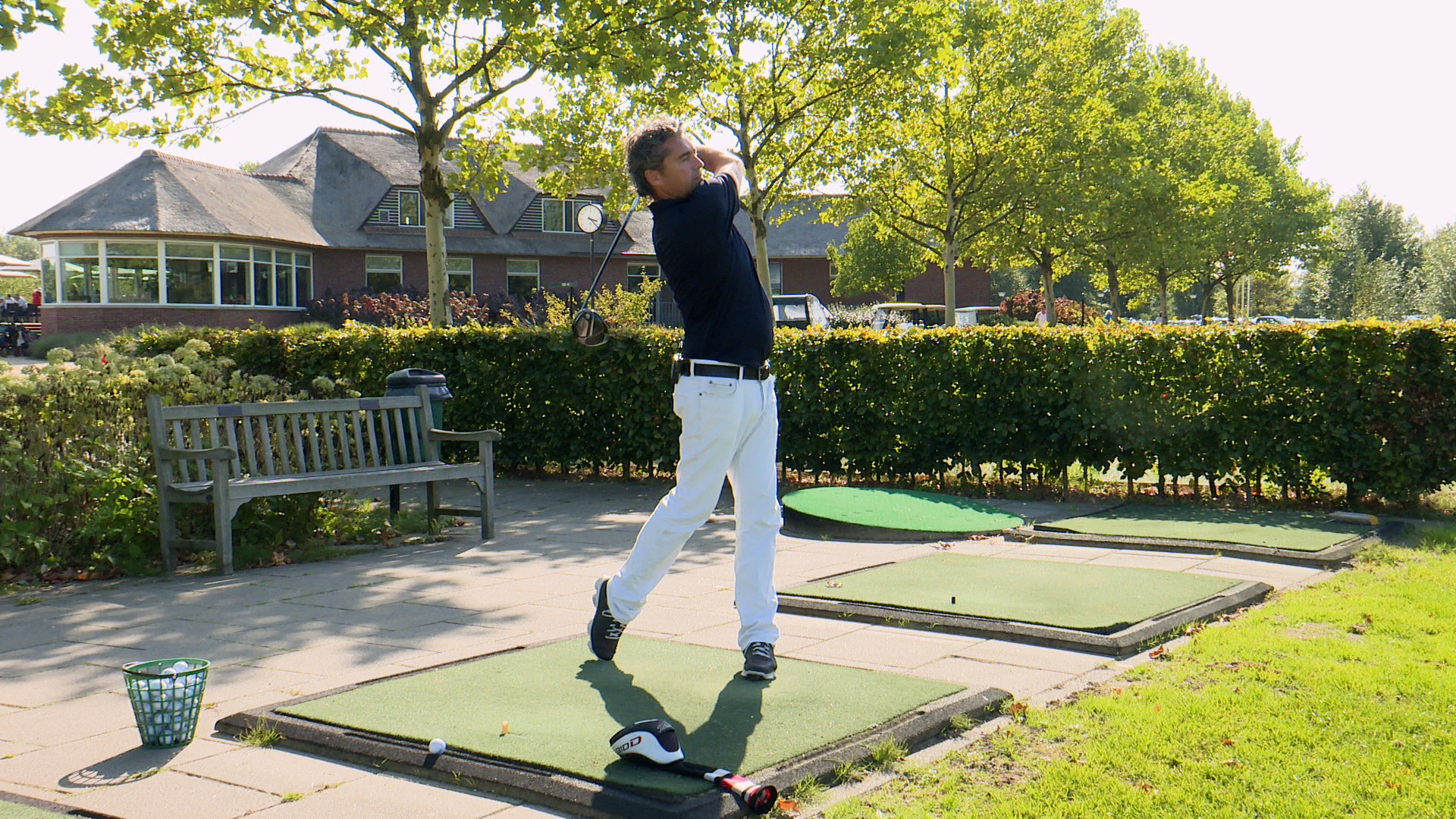 Je hebt een mandje ballen nodig. Om de bal met je driver een goede verre klap te geven, is het belangrijk om in de juiste positie te beginnen. Je bal ligt aan de binnenkant van je linkervoet, je bal is hoog opgeteed en staat in lijn met het slagvlak van de club. Je hebt je wervelkolom een klein beetje naar achter gekanteld. Vanuit deze positie kun je je achterzwaai goed maken en de bal in een opwaartse beweging raken. Dan vliegt de bal het verst.