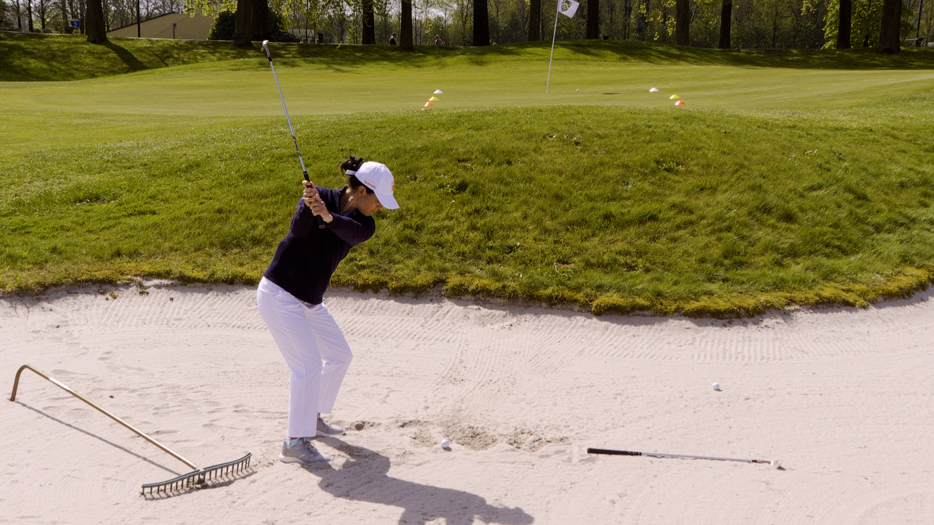 Je hebt 9 ballen nodig en deze gooi je willekeurig over je hoofd de bunker in. Speel vervolgens alle 9 ballen zoals je ze aantreft naar dezelfde vlag op de green. De uitdaging is om ten minste 6 ballen binnen 3 meter van de hole te laten eindigen. Blijf dit proces herhalen totdat dat gelukt is. Geef jezelf een half uur de tijd om deze opdracht te voltooien. Pas de doelstelling eventueel aan aan jouw niveau, maar hou deze scherp én realistisch. Evalueer welke liggingen je goed afgaan en welke minder.