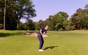 Leg 2 toursticks evenwijdig op de grond in de richting van het doel, waarbij de afstand tussen de sticks net iets breder is dan je clubhoofdbreedte. Plaats ook een tourstick aan de voor- en achterzijde van de ‘landingsbaan’ op de baldoellijn. Leg de bal midden tussen de toursticks en speel deze naar de hole zonder de sticks te raken. Check je backswing en doorzwaai door goed te kijken naar de toursticks aan de voor- en achterzijde van de landingsbaan. Stel: er komt een laserstraal uit het clubhoofd van je stok, schijnt deze dan in je achterzwaai naar de tourstick aan de achterzijde van je landingsbaan en in je doorzwaai naar de stok die vóór je landingsbaan ligt? Zo ja, dan laat je je bal in een functionele baan bewegen.