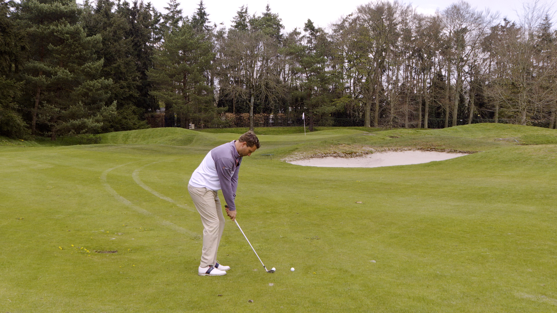Je kunt verschillende wedges gebruiken. Om het makkelijker te maken, leg je de bal iets verder van de tourstick af die op de grond ligt. Gaat dat goed? Leg hem dan steeds meer naar de tourstick toe.