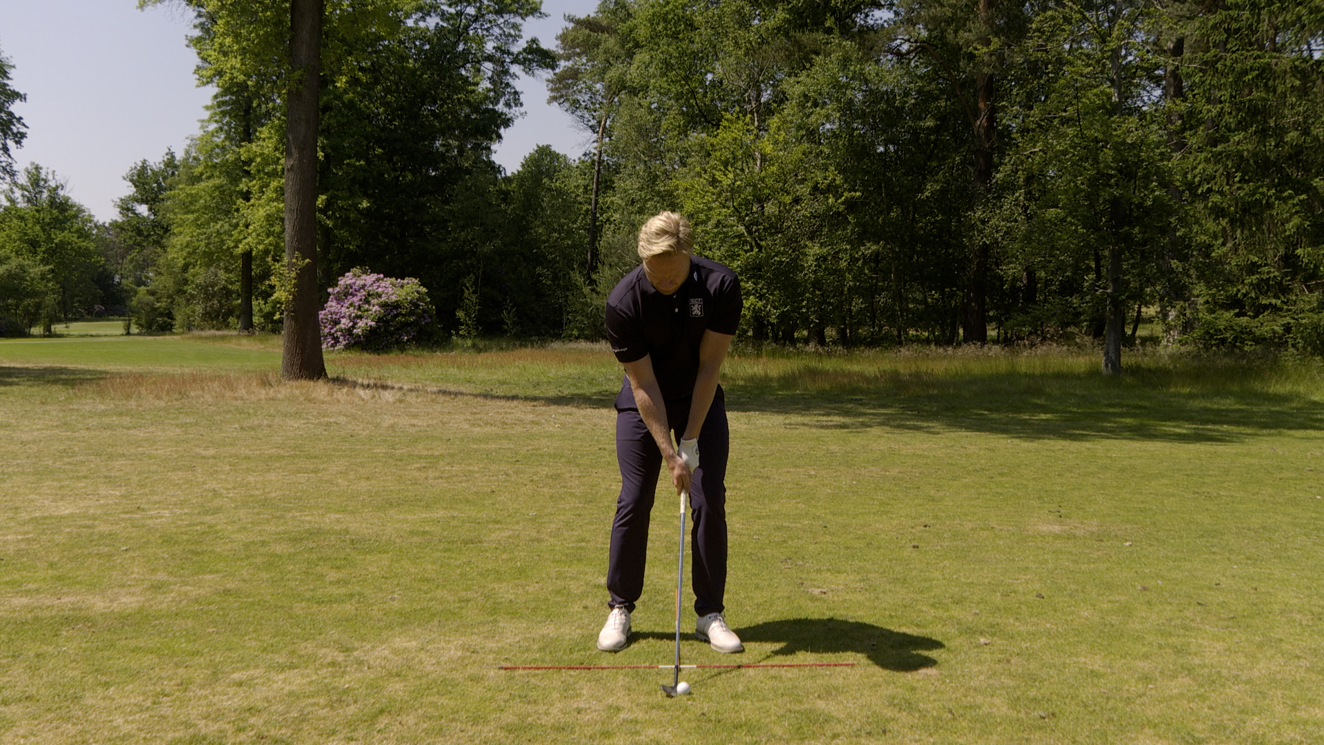 Doe deze oefening met een wedge op de range of zoek een situatie met een vlakke fairway-ligging op 40-60 meter tot de vlag. Zet je club rechts naast je voet (trail side) op de grond. Vervolgens sleep je je club lang over de grond in één keer door naar je eindstand om het gevoel dat je wilt hebben van ‘door de bal heen slaan’ te activeren. Veel golfers trekken de club vaak alleen maar met hun handen door de bal heen, maar we willen eigenlijk zorgen dat je benen, heupen en buik je club door de bal heen trekken en je heel lichtjes omhoog beweegt. Dat is het gevoel dat je wilt hebben van door de bal heen. Zorg er dus voor dat je lichaam, armen en handen de club gezamenlijk naar de eindstand brengen en voel dat de shaft lichtjes naar het doel leunt wanneer je de impact passeert. Voordat je slaat 1 of 2 keer slepen en probeer dan met bal dat gevoel na te bootsen.