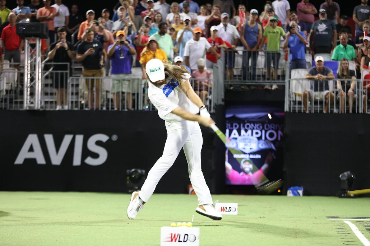 Foto: Boven - Bryson DeChambeau tijdens de Arnold Palmer Invitational (4-7 maart 2021) waar hij de par-5 6de hole afsneed. Onder - Kyle Berkshire (de wereldkampioen long driving in 2019) en Nederlands kampioen Bob de Boef.