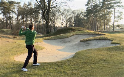 Wanneer je dit wilt oefenen (en ook nog eens het gras wilt sparen) kun je het beste in een bunker gaan staan.