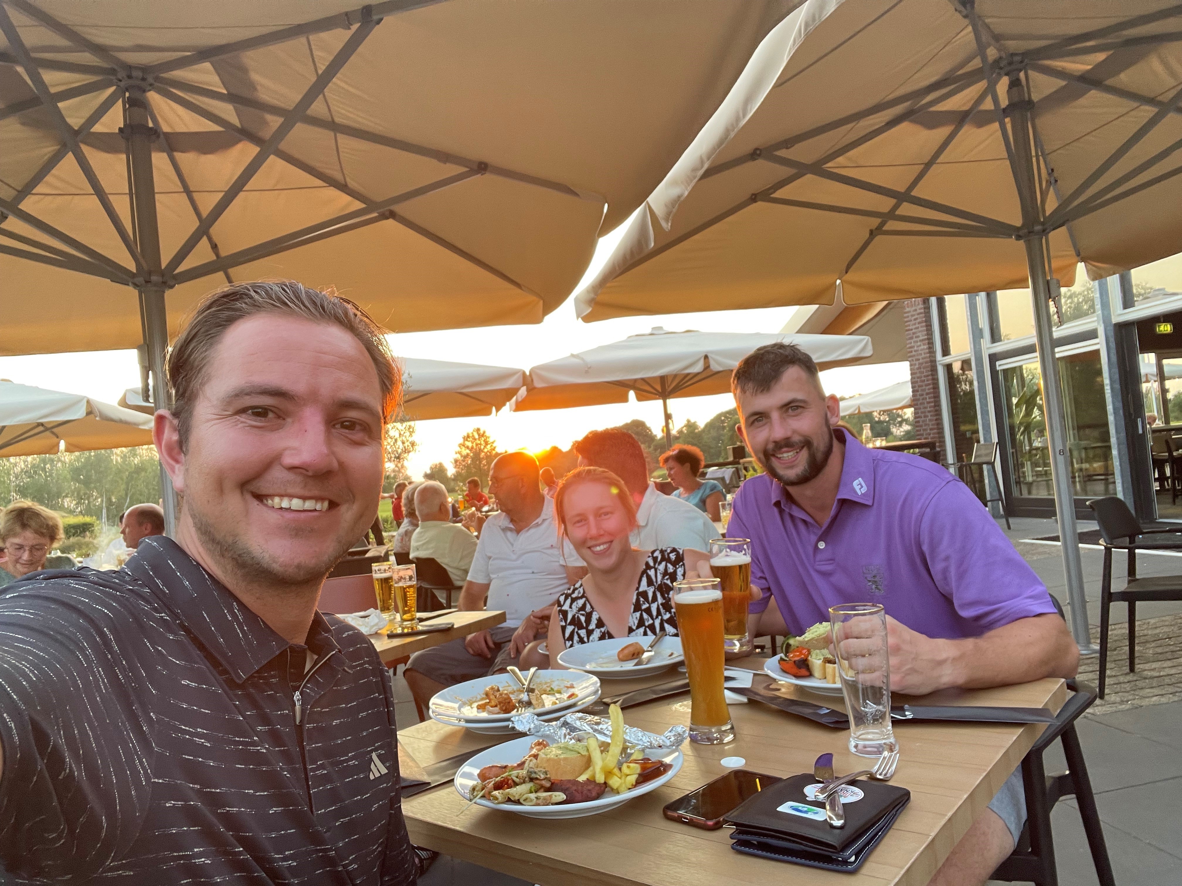 Ralph, Louise en Stef aan het begin van de tweede 18 holes.