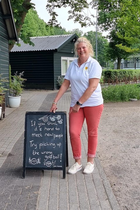 Toen ze begon vorig jaar bij de club waar ze zelf al zes jaar golfde, toetrad tot het team van caddiemasters, had ze de eerste spreuk al in haar hoofd. "Je kunt mensen vriendelijk vertellen wat ze niet mogen, maar je kunt ze ook heel vriendelijk ontvangen. Met gastvrijheid kun je heel veel bereiken.” Die spreuk haalde niet het krijtbord, maar het duurde niet lang of Floor gebruikte het vaak weggemoffelde bord om de golfers op originele manier te begroeten. Of ze een hart onder de riem te steken. Het bord staat dicht bij het onderkomen van de caddiemasters, op de route naar hole 1.