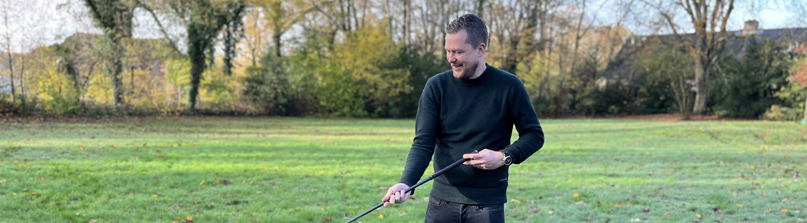 Goh, vrij logisch eigenlijk… Marc krijt een dikke lijn op de mat, enkele centimeters verder dan waar de bal ligt. “Dáár moet je de grond raken met je club, dus áchter de bal”, zegt Marc. Hij ziet dat ik aanvankelijk worstel met zijn aanwijzingen. “Volgens mij ben jij van nature een denker, en schieten er nu talloze dingen door je hoofd”, zegt hij. “Ik moet jou eerst helemaal resetten. Focus je alleen op het raakpunt.”