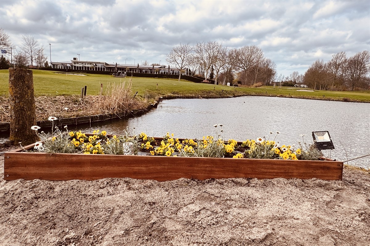 Het eilandje was niet meer dan een overwoekerd perceel en doet na uitdunning nu dienst als baken voor onder meer vogels en insecten. Het perkje met bloemen, een door een creatieve greenkeeper gemaakte houten waterbak en twee eendenkooien maken het tot een klein paradijs dat voor de mens via een houten brug is te bereiken. Een mooie naam voor deze plek ontbreekt alleen nog…