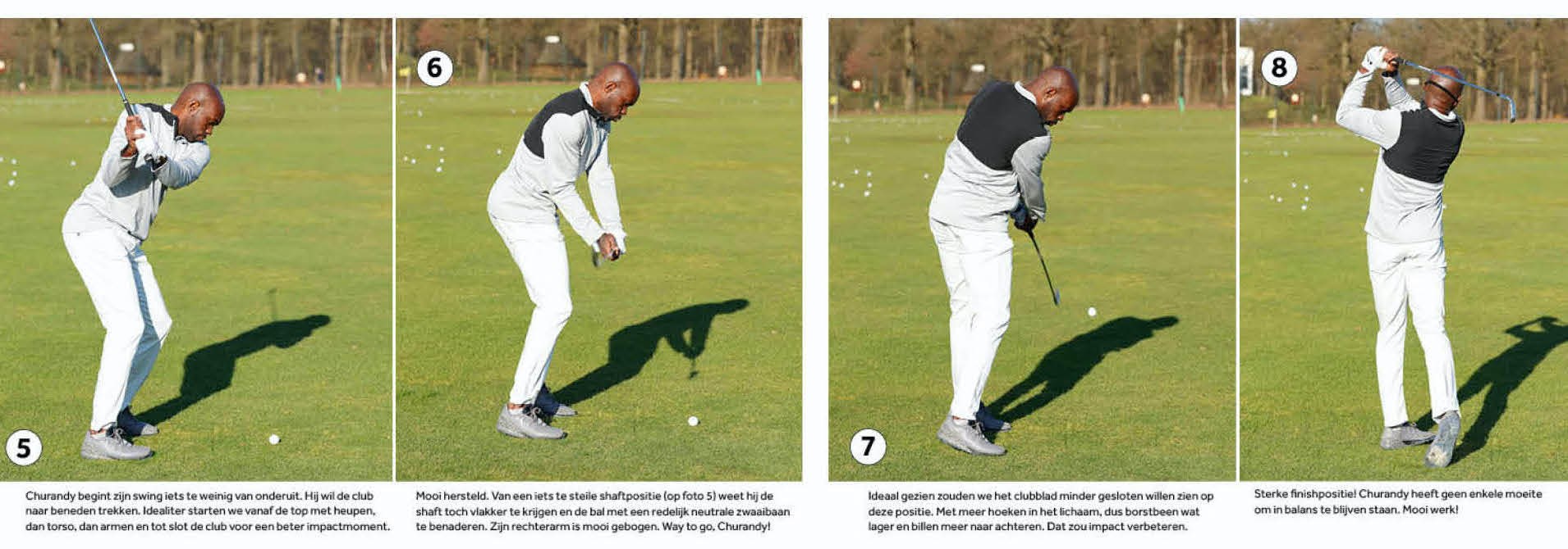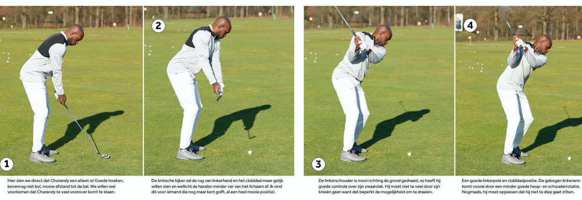 “We hebben veel aandacht besteed aan de fundamentals van golf, meteen vanaf de eerste les besef creëren van het belang van een goede grip, de set-up en het oplijnen van het lichaam en het clubface. De swing van Churandy is uiteraard nog volop in ontwikkeling, maar voor iemand die nog maar net is begonnen, heeft hij al een aantal mooie posities in de swing. Zijn atletische lichaam, sportmentaliteit en de wil om te trainen helpen uiteraard enorm. Ons doel is dat Churandy nog meer begrip krijgt van wat er op impact moet gebeuren met de bal en club. Waar we duidelijk aandacht aan moeten blijven schenken is een betere lichaamsrotatie en beter gebruikmaken van de grond.