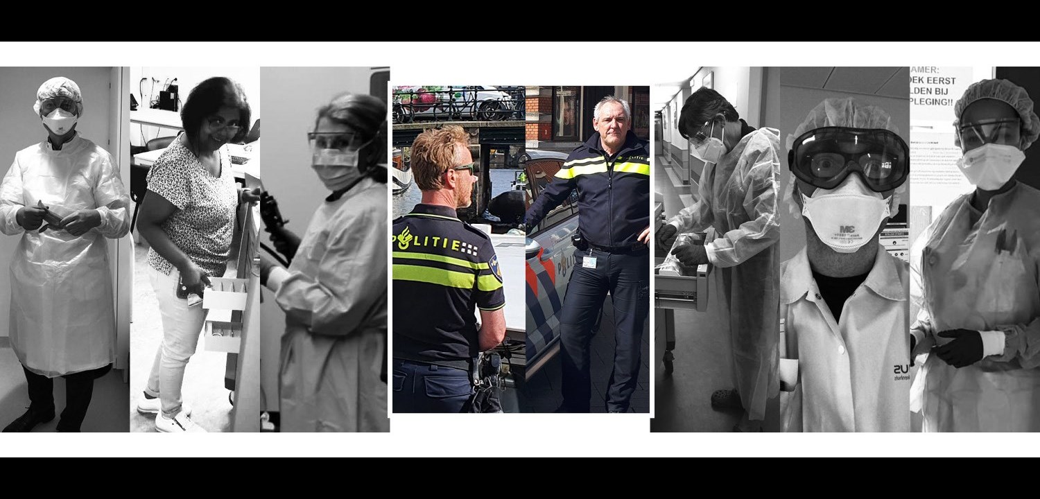 Anderhalve meter afstand houden van collega’s en anderen lukt niet altijd, niet tijdens een dienst met collega’s en niet bij bepaalde hulpverlening of aanhouding. Dat ze bezorgd zijn, is niet vreemd. Je weet nooit met wie en wat je in aanraking komt. Met Amsterdamse humor probeert het tweetal zich door deze periode heen te slaan.