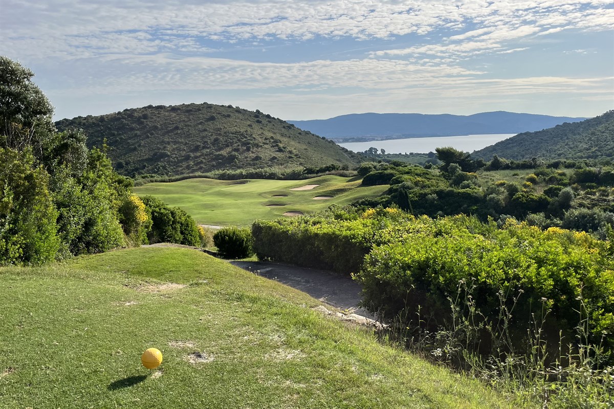 Schuin links van het terras wagen drie golfers zich aan de tweede negen, met een uitdagende afslag op hole 10. Want niet alleen het terras kijkt mee; het vijvertje dat voor ze ligt, vraagt toch om een carry van zeker 120 meter. Die opdracht is voor twee van de drie bij een eerste poging een te zware. Toch krijgen we niet de indruk dat ze daar onder gebukt gaan. Misschien zijn ze met hun hoofd al bij een koel glas Vermentino, wijn van de streek.
