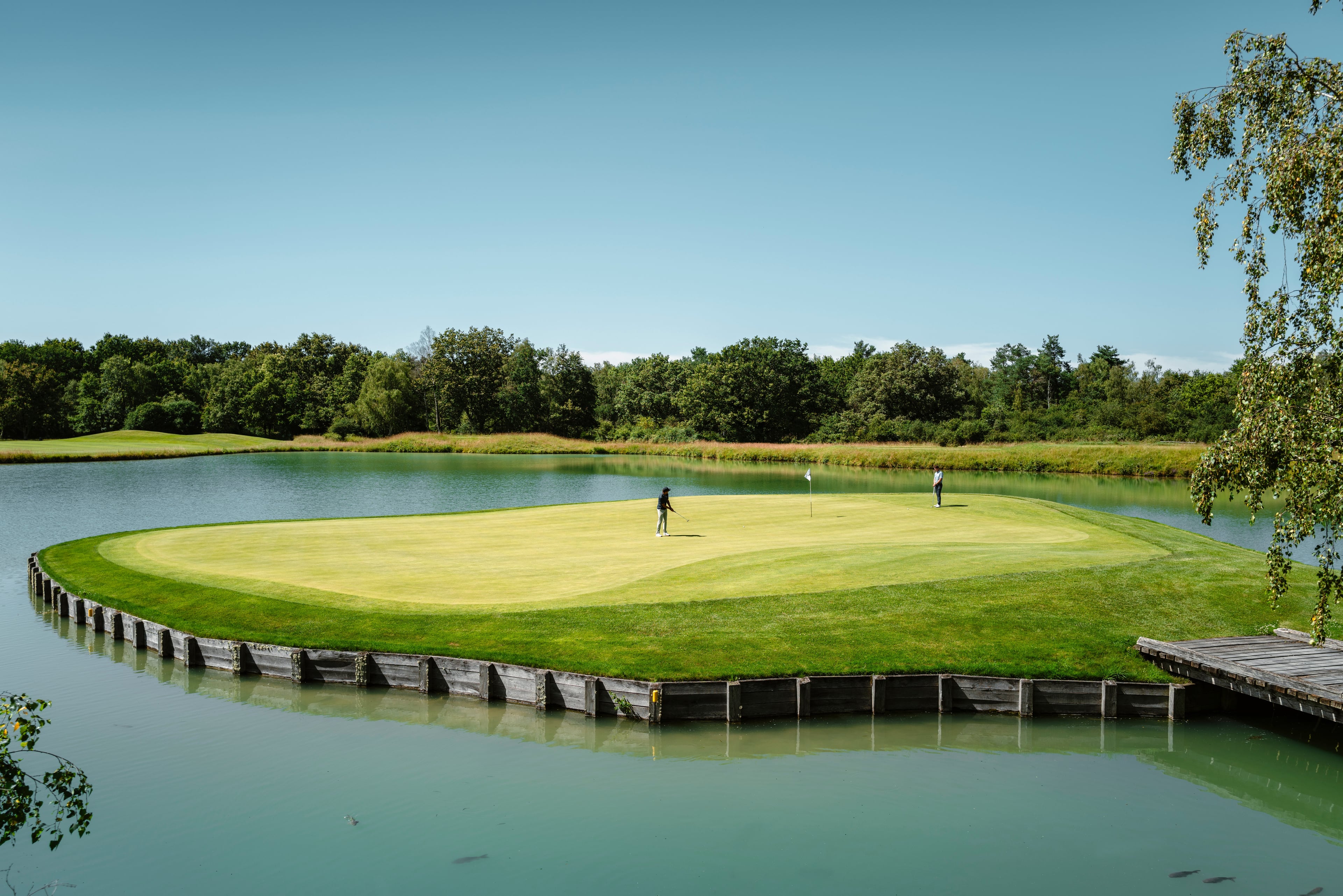 Maar hier geldt wel: what you see is what you get. De uitdaging is steeds overduidelijk. Exemplarisch is hier hole 14. Een par 5 van 488 meter van de Member Tee’s. Water links, water rechts, en een bunker in de landingszone. Wie kaarsrecht is en de carry over de bunker haalt, krijgt wel extra meters van het speed slot achter de heuvel in de landingszone van de fairway. De big hitters kunnen dan een tweede slag naar de green overwegen. Of ze dat doen is de vraag, want de green is een eiland, letterlijk een eiland, alleen door een smal bruggetje verbonden met de rest van de golfbaan. Denk TPC Sawgrass 17, maar dan op een par 5! Ook de lay-up is niet zonder problemen; op de ideale wedge-afstand van de green eet de waterhindernis links een hap uit de fairway en loeren rechts twee enorme bunkers.