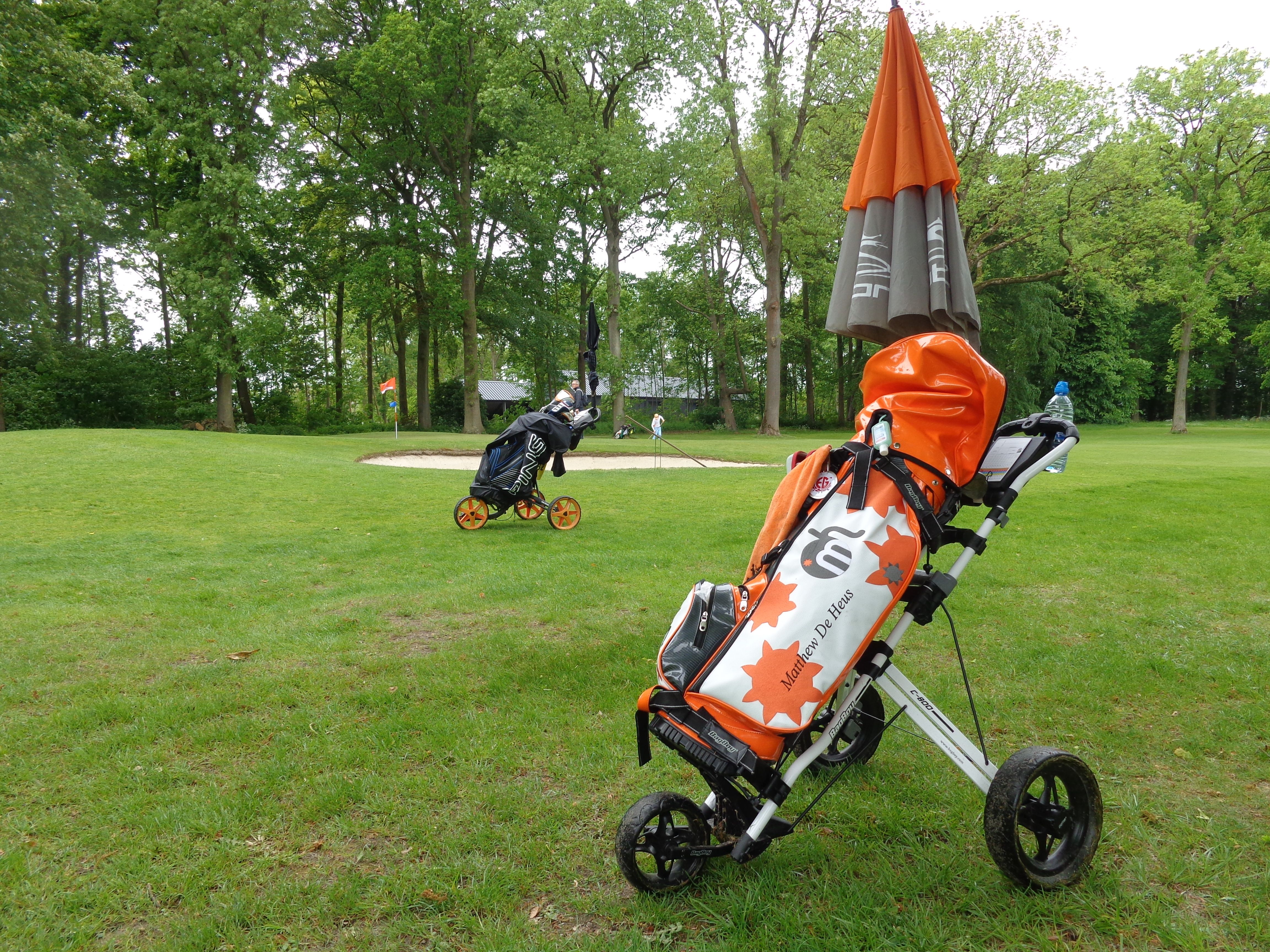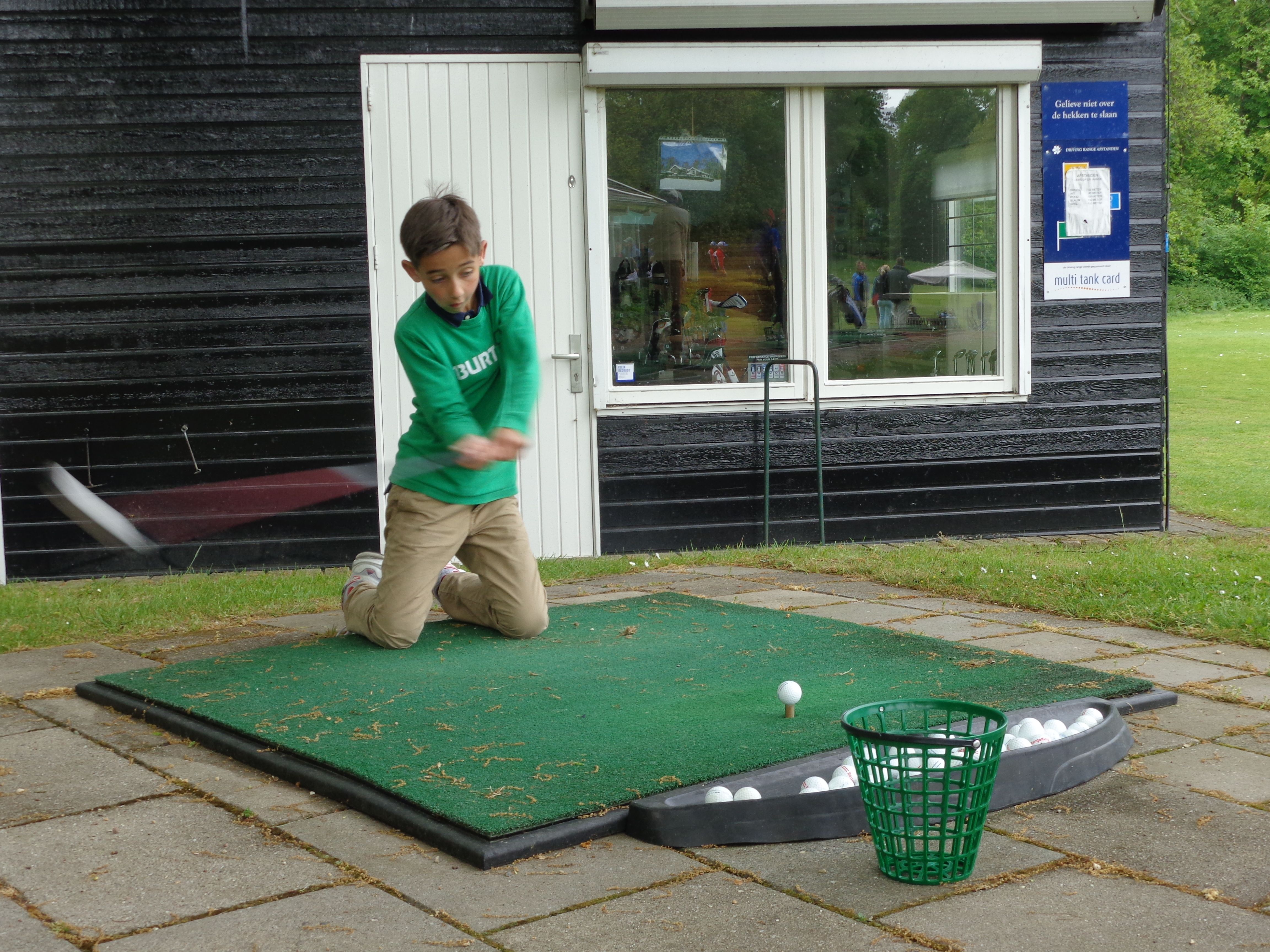 De meisjes speelde van de oranje tee, de jongens van de rode tee.