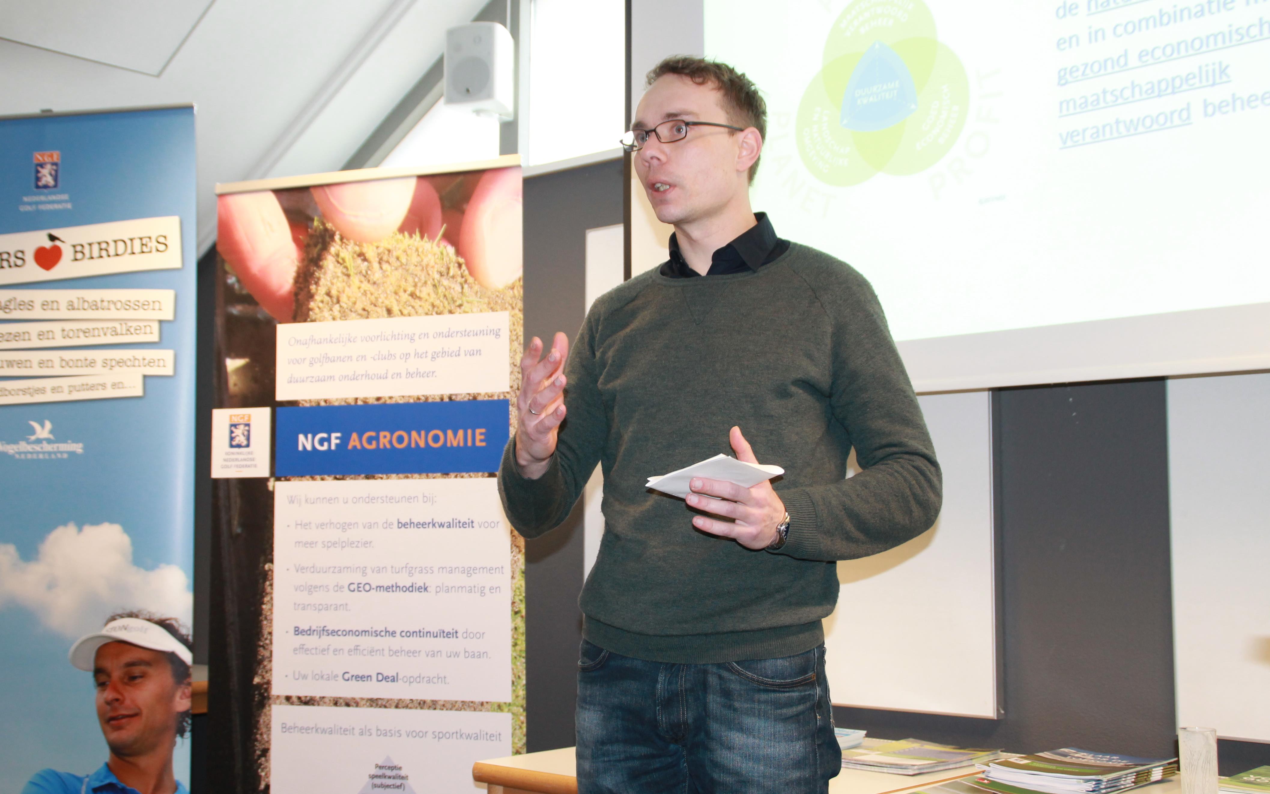 Bastiaan Geurts van Stern Auto, een nieuwe partner van de NGF op het gebied van duurzaamheid, benadrukte vooral de zakelijke waarde van duurzaamheid. Hij beschreef het interne proces dat hij heeft doorlopen om aandacht te krijgen voor het onderwerp Maatschappelijk Verantwoord Ondernemen. Hoewel de golfsport en de core business van Stern uiteenlopend zijn, blijkt er opvallend veel overeenkomst te zijn met de GEO-methodiek en de duurzaamheidsthema's als afvalmanagement, energieverbruik, milieukwaliteit en mens en maatschappij.