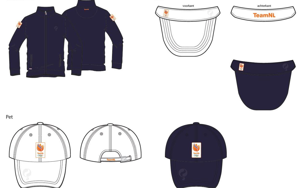 Op de rechtermouw staat het logo van TeamNL met de Olympische ringen. Dat is ook terug te vinden op de pet en de visor (zonneklep)