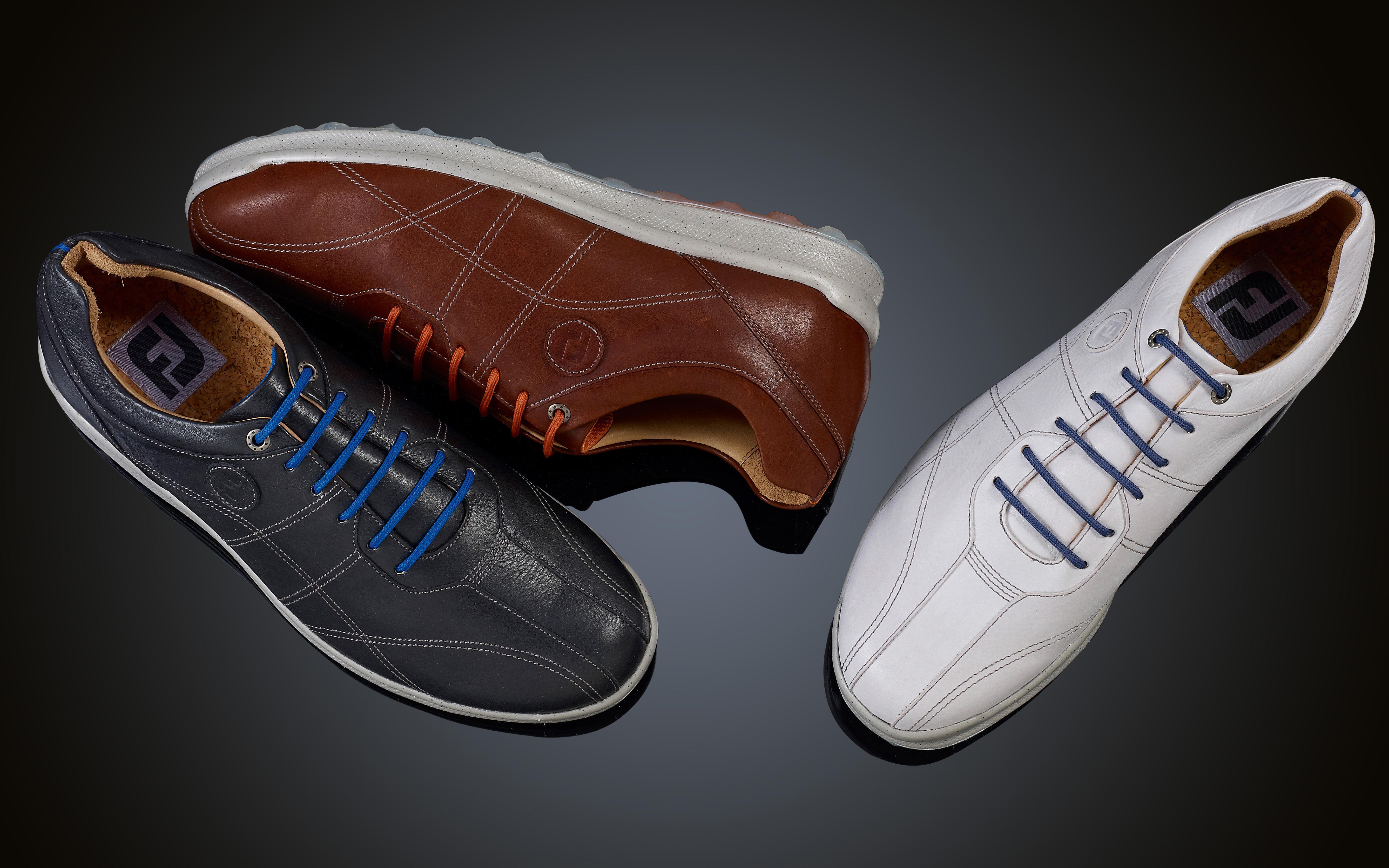 De VersaLuxe-golfschoenen zijn beschikbaar in wit, bruin en zwart met kleurrijke en contrasterende veters en een garantie op waterdichtheid van één jaar.