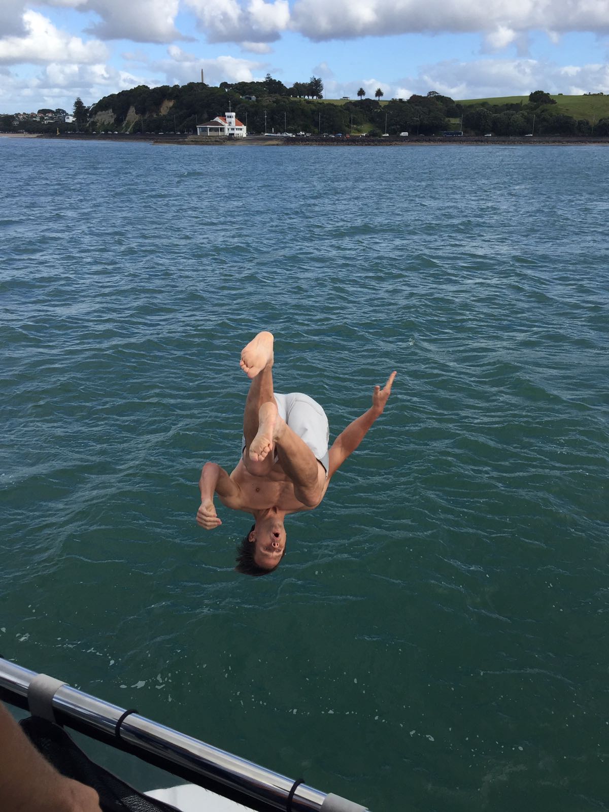 Daarna hadden we een boottochtje rond Auckland op een prachtig motorjacht, georganiseerd voor de sponsoren. Magnifiek uitzicht op de stad met de prachtige skyline en ondanks het koude water (16 graden) toch even een duik genomen in de zee.