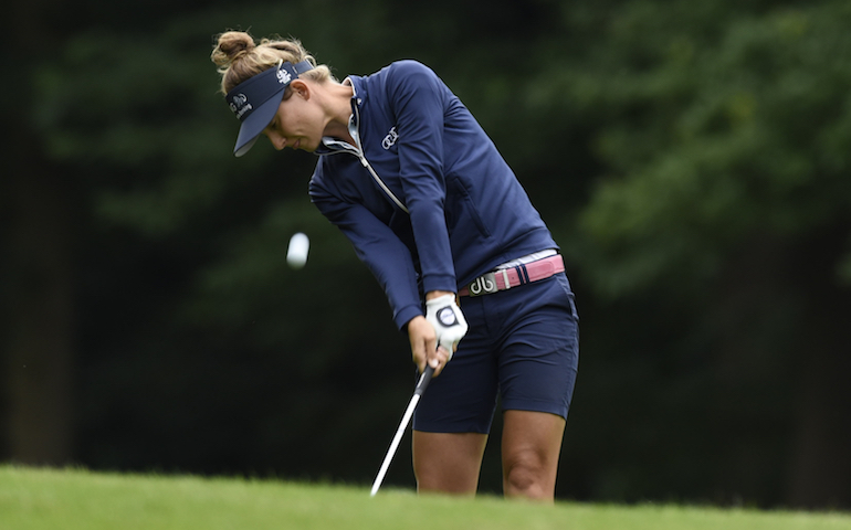 De speelster van Golf Team Holland behaalde duidelijk voordeel ten opzichte van de rest van het veld met haar lengte van de tee. 'In deze hitte gaan mijn drives erg ver. Op sommige holes heb ik nog maar 40 of 50 meter over naar de green.'