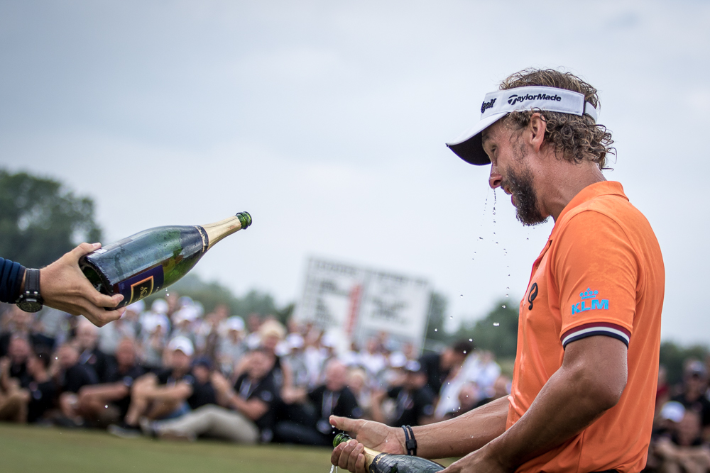 In de laatste ronde van het KLM Open toverde Luiten iets heel speciaals uit zijn clubs. Een droomstart met birdies op de eerste twee holes. Er volgden twee bogeys maar ook nog eens acht birdies. “Ik hoefde maar naar de hole te kijken en mijn bal ging er in. Ik zat in The Zone, alles ging vanzelf.” En alles zat ook nog eens mee. De afslag op hole zestien een fractie meer links en de bal blijft niet op de green maar ketst in het water. De tweede slag op hole zeventien wilde Luiten een meter of vijf rechts veilig van de gevaarlijk weggestoken pin laten landen. Plof, meter van de hole. “Ik pull die bal naar links en hij eindigt bij de hole, dat soort gelukjes heb je ook nodig om te winnen.” Links van die zeventiende hole zie je in de verte de kerktoren van de Hersteld Hervormde Gemeente in Spijk. Sporten op zondag wordt daar niet op prijs gesteld. Maar de golfgoden hadden duidelijk hun zegen gegeven aan een glorieuze overwinning van Joost Luiten in het KLM Open 2016.