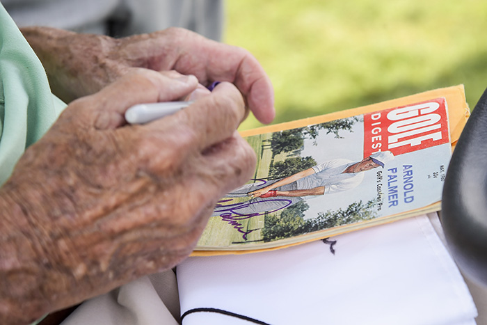 De oude Arnold Palmer signeert een tijdschrift met de jonge Arnold