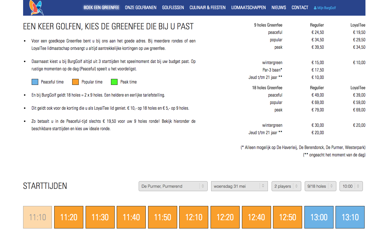 BurgGolf verdeelt elke dag dus onder in rustige uren, populaire uren en piekuren. Op de Peaceful-tijden speel je bij BurgGolf negen holes voor €19,50 en 18 holes voor 39 (bij BurgGolf is 18 holes gewoon twee keer de prijs van negen). Op de Popular- en Peak-uren betaal je meer voor een greenfee. BurgGolf sprak in een bericht aan klanten over 'een nieuw tariefstelsel voor greenfees dat beter moet aansluiten bij de ontwikkelingen en de wensen in de golfmarkt.'