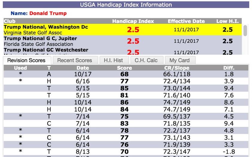 Donald Trump speelde tot kort geleden van handicap 2,8 en had sinds juni 2016 geen enkele score voor zijn handicap ingeleverd. Hij had een inactieve handicap zoals dat vroeger in Nederland heette. Maar sinds 1 november staat er opeens wel een score op zijn handicappagina, een kaart gespeeld in oktober 2017 en een lage score: 68 slagen bruto. Weliswaar op een baan met een course rating van 66,1 maar dan nog.