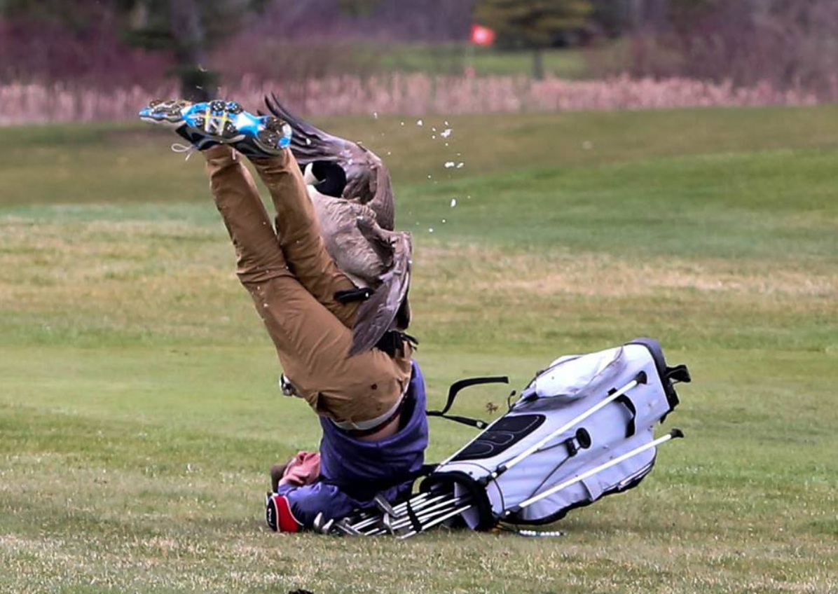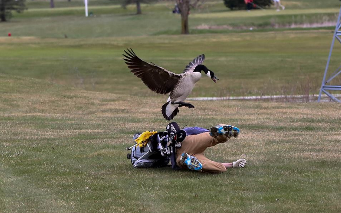 Het potje golf van Isaac Couling, een middelbare scholier uit de Amerikaanse staat Michigan, werd afgelopen zaterdag ruw verstoord. Terwijl hij en zijn flightgenoten op de fairway van 7de hole van de Wolf Creek Golf Course nietsvermoedend naar hun bal liepen, kreeg een gans de kolder in zijn kop. Hij had het op de arme jonge golfer gemunt en werkte hem na een korte achtervolging met golftas en al tegen de grond.