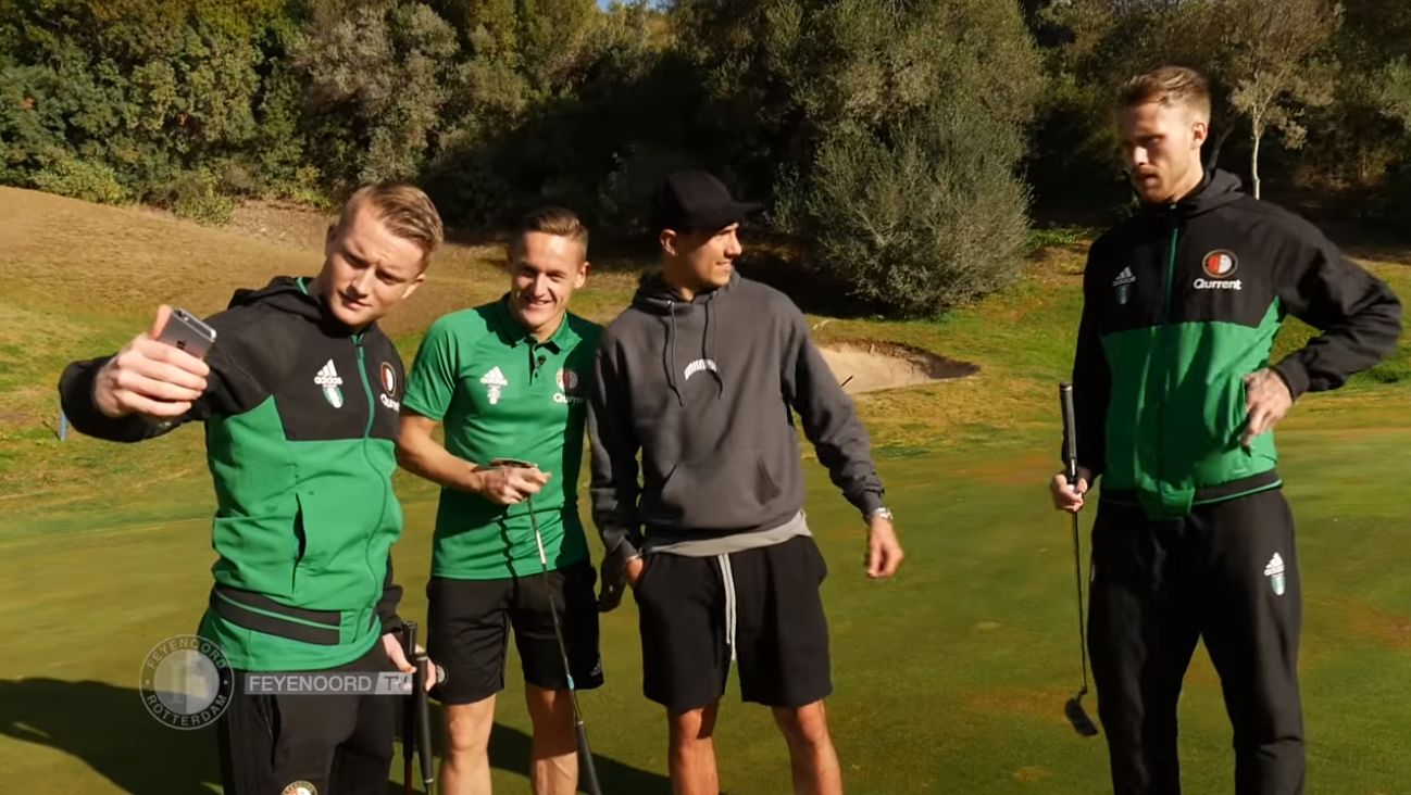 Bekijk de video in de player boven dit artikel vanaf 1 minuut en 5 seconden. In het filmpje zien we Steven Berghuis, Jens Toornstra, Nicolai Jørgensen en Sam Larsson op de golfbaan. Over het niveau van het golf zeggen we niets, oordeel zelf ...