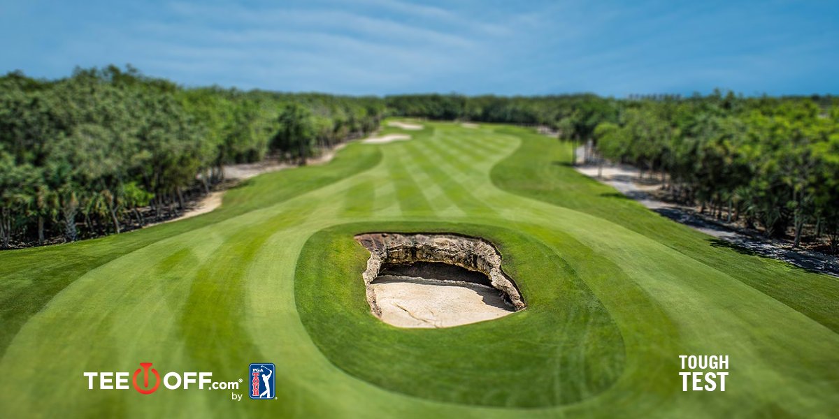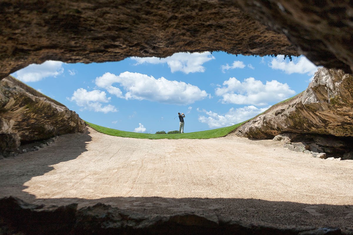 Op de foto hieronder (zie ook de foto's boven de tekst) zie je de Cave Bunker van El Camaleón Golf Club in Mexico. Intimiderend en niet makkelijk om er uit te komen. En deze bunker kom je al tegen op de eerste hole (maar het is hole 7 als de PGA Tour op bezoek komt). De bunker is onderdeel van een van de ondergrondse grotten met water die je tegenkomt op de baan in Playa del Carmen.