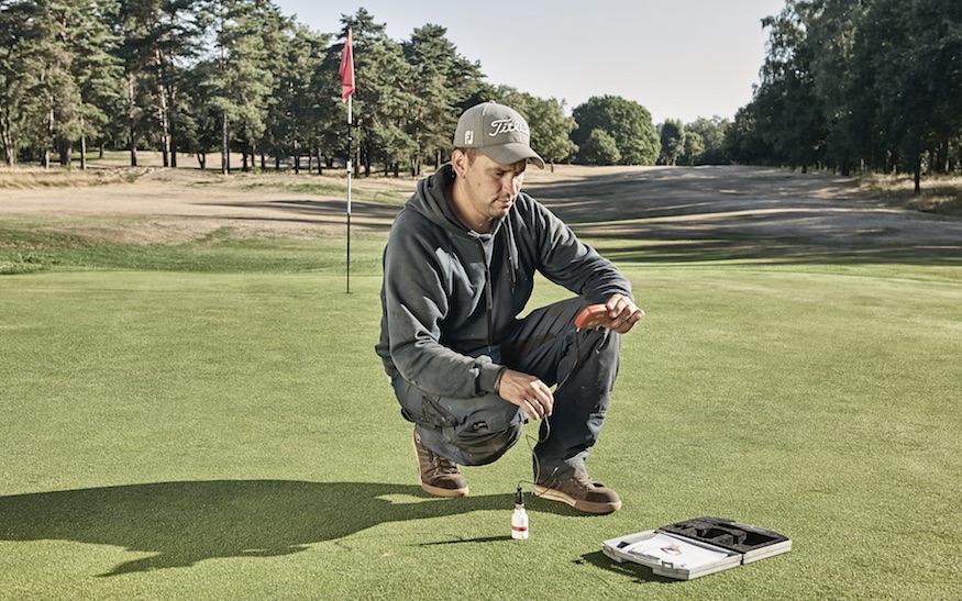 “De vochtmeter is volgens mij een van de belangrijkste gereedschappen van de greenkeeper, zeker als je naar de toekomst kijkt. Ik heb net vier modellen uitgeprobeerd en ga daaruit een keuze maken. Met zo’n meter bekijk ik op de greens en tees het vochtpercentage, dat soms enorm per gedeelte verschilt. Zo kan het rechtsvoor een stuk natter zijn dan linksachter. Dankzij goede statistieken kun je veel preciezer beregenen, met als gevolg minder waterverbruik en duurzamer onderhoud. Alles heeft te maken met het verwelkingspunt van de plant, bij welk vochtigheidspercentage droogt de plant uit? Bij Houthalen is het ideale percentage 22 procent dat in de loop van de dag bij droog weer terugzakt naar 14 procent. De weersomstandigheden spelen natuurlijk een grote rol. In juli was het bijvoorbeeld extreem droog, wat alles weer anders maakt. Ik ben eigenlijk steeds aan het spelen om de juiste balans te vinden, met hulp van de vochtmeter.”