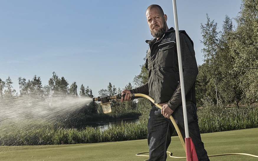 “Dit is een soort waterpistool om de droge plekken op green en tee handmatig te bewateren. Dit kun je heel gericht doen, wat twee grote voordelen heeft. Ten eerste wordt de rest van de green niet te nat en dat is gunstig om straatgrassen weg te houden. Die gedijen namelijk bij grote vochtigheid en houden niet van droogte. Ten tweede zul je uiteindelijk minder water verbruiken. Deze waterspuit bestaat al lang maar wordt in greenkeeping tegenwoordig veel vaker gebruikt omdat je het proces om de grassen gezond te houden, beter kunt managen. Met het blote oog zie ik vaak al welke plekken te droog zijn. Bovendien, als je een baan goed kent, leert de ervaring dat. Met een vochtmeter kan ik mijn vermoeden bevestigen. Golfers weten vaak wel dat er alleen maar water uit die slang komt, maar ik leg het graag uit als ze erom vragen.”
