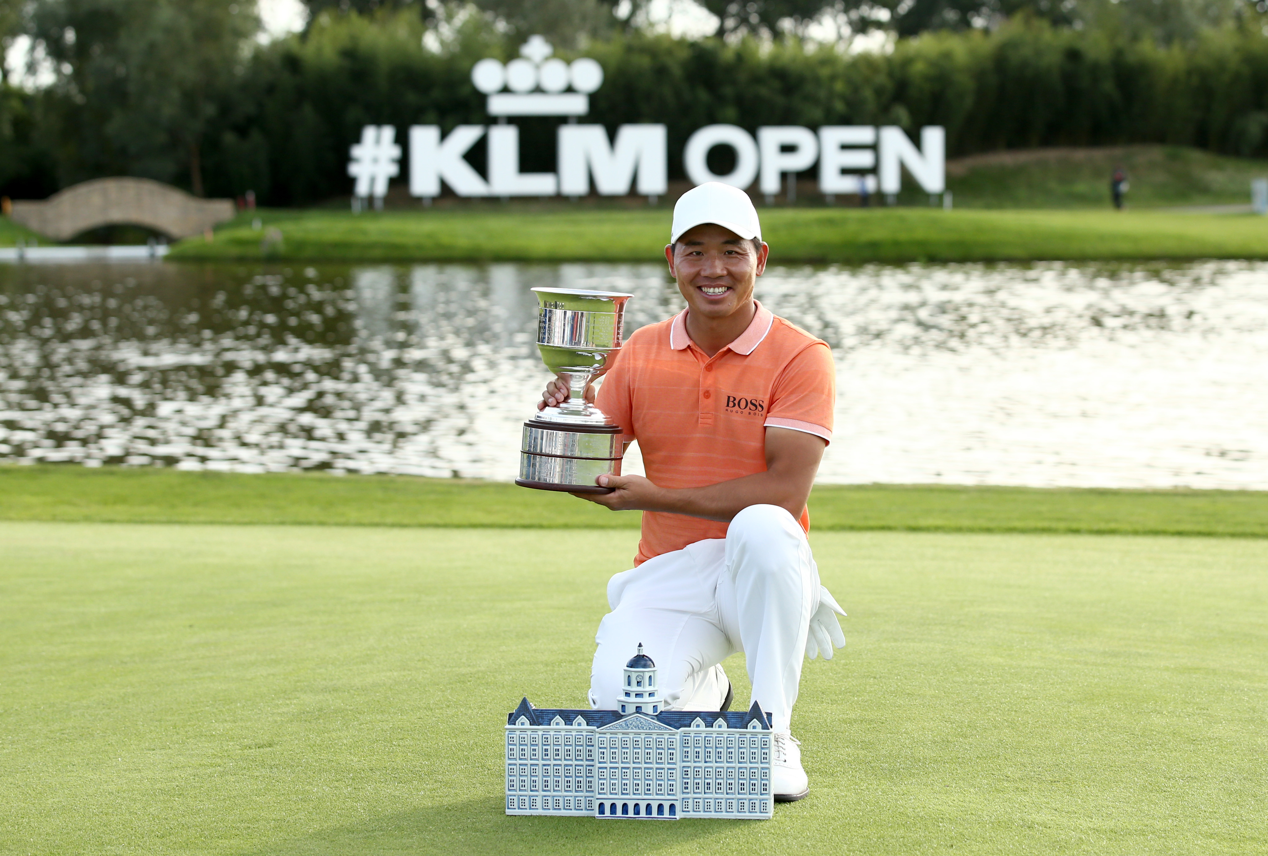 De gasten van de laatste aflevering van KLM Open Vandaag TV: Joost Luiten, Max Albertus en de kersverse winnaar van het KLM Open, Ashun Wu.