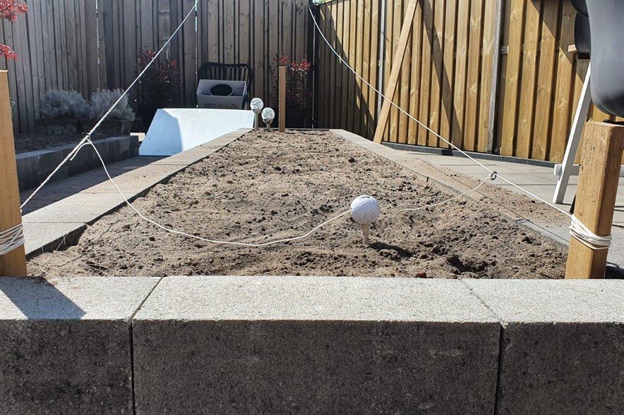 Boor een gat door de golfbal heen en rijg het aan een touwtje. Dit touwtje moet breder zijn dan de afstand tussen de houten paaltjes en iets smaller dan de afstand tussen de uiteinden aan de bovenkant.