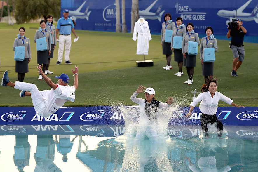 De winnaar van de ANA Inspiration springt na de laatste putt traditiegetrouw in Poppie’s Pond, de waterhindernis bij hole 18. Misschien dat de andere spelers ook een duik gaan nemen, want iedereen zal snakken naar wat verkoeling. Deze major wordt normaal gesproken in april gespeeld, maar door corona is het toernooi verplaatst naar september. En in deze tijd van het jaar kunnen de temperaturen in Ranco Mirage, gelegen tussen Palm Springs en Palm Desert, lekker oplopen. Afgelopen weekend werd de 48 graden Celsius aangetikt... De voorspelling is iets koeler tijdens het toernooi, maar veertig plus is nog altijd goed mogelijk. Dus wordt het ook een gevecht tegen de zinderende hitte. De LPGA, niet altijd buigzaam als het om regels en voorschriften gaat (zie onder), heeft daarom besloten dat de caddies trolleys mogen gebruiken.