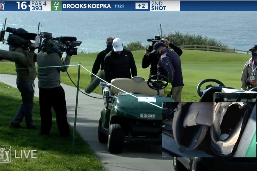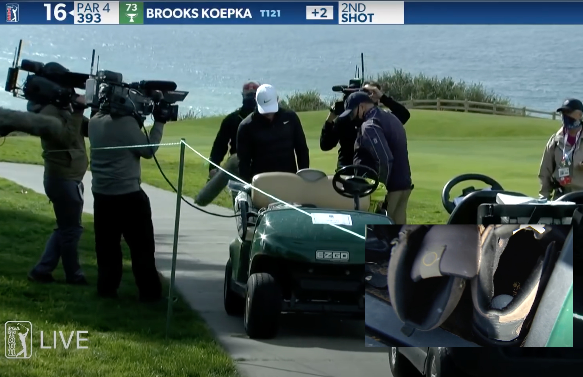 Een golfbal in je schoen? In het geval van Brooks Koepka ging het niet om zijn eigen schoen, maar om de reserveschoen van een cameraman die achter op een buggy stond. De bal die Koepka afgelopen weekend sloeg op de 16e hole van de Torrey Pines Golfclub tijdens de Farmers Insurance Open (PGA Tour), landde in deze (volgens Koepka niet geheel schone) schoen. "I ain't sticking my hand in there", zo reageerde hij. En tegen de cameraman: "You can grab it out of your nasty ass shoe".