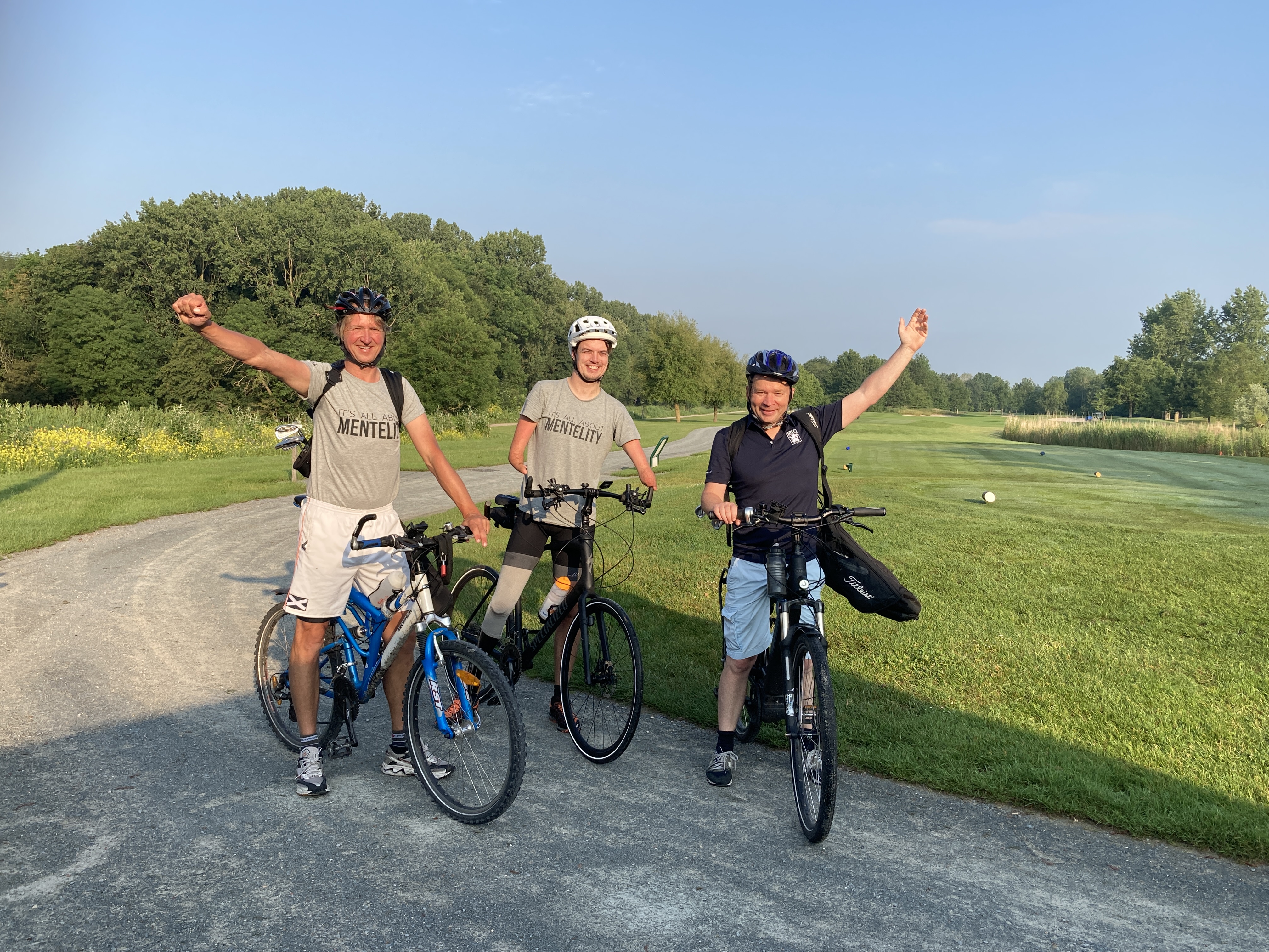 Derk ter Braak (hcp 4,5) en Naud Frese (hcp 11,8), zijn fervente golfers én fietsers. Tijdens de eerste lockdown in 2020 waren de golfbanen gesloten en hebben de mannen veel gefietst. Toen ontstond het idee om zodra de golfbanen weer open zouden gaan 18 holes te spelen voor het goede doel. Maar dan wel op 18 verschillende golfbanen! Tussen die 18 golfbanen verplaatsen op de fiets! Alsof 155 kilometer op de fiets met 18 holes golfen nog niet pittig genoeg was, hadden ze ook afgesproken om het nog iets uitdagender te maken (en qua bagage op de fiets iets minder zwaar): maximaal drie golfclubs per persoon waaronder een putter. In 2020 haalde het drietal ruim € 8.000 op voor de Mentelity Foundation.