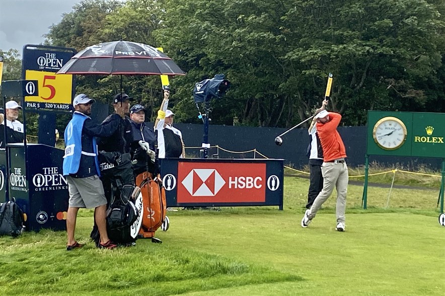 Vervolgens trekt de in een oranje jack gehulde Nederlander twee zwarte regenhandschoenen aan, want de druppels vallen niet hard maar wel heel gestaag. Met de driver slaat de Nederlander zijn bal vervolgens te veel rechts, in één van de 81 bunkers die een groot gevaar vormen op Royal Liverpool. De linksbaan wordt ook wel Hoylake genoemd naar het kustplaatsje in het noordwesten van Engeland waar de club gelegen is.