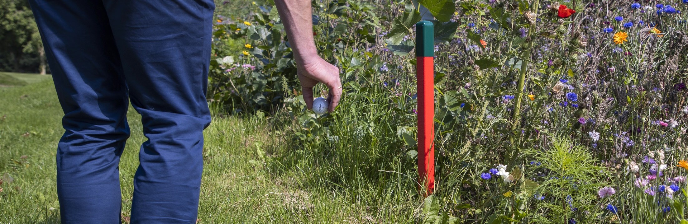 Cees: “Ik sloeg een bal buiten de baan (witte paaltjes) tegen de muur van een huis. Na zoeken lag de bal toch op de fairway. Mag ik dan zonder straf verder spelen?”