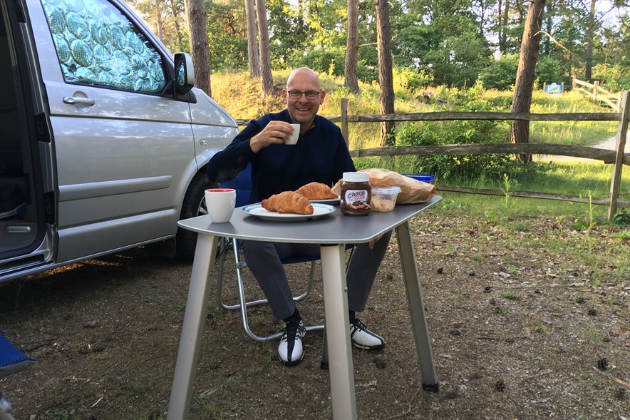 "Vaak boek ik de eerste starttijd van de dag, maar als dat niet lukt ga ik op mijn gemakje ontbijten, voor mijn camper. Of er komt iemand met een bordje het clubhuis uit wandelen. Ik krijg zo nu en dan gewoon een special treatment. Dat is toch fantastisch. Neem de douches op een golfbaan, er zijn altijd schone handdoeken. Maar serieus, dan zitten we te dineren met een wijntje erbij en horen we hele dialogen tussen twee uilen, of er komt 's morgens een vosje koekeloeren. Dan kijk ik mijn vrouw Liza aan, we proosten en beseffen dat we het goed hebben. Ik heb niet veel nodig om een gelukkig leven te hebben."