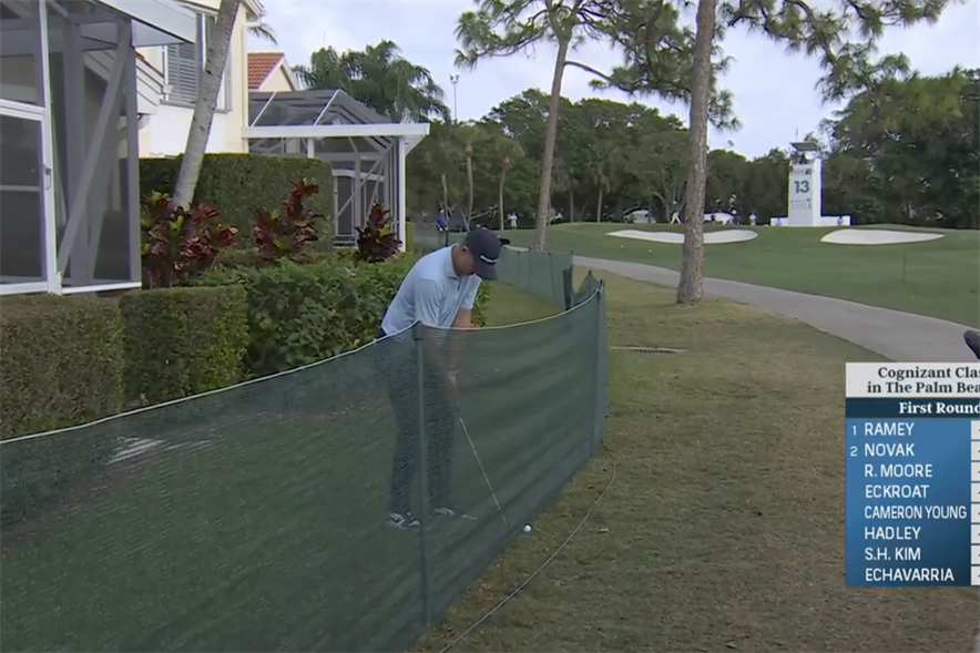 Nee, Rose is hier niet aan het tuinieren bij een van de huisjes op het resort in Florida. Hij is over het hekje gestapt en staat zelf in de tuin. De tuin is out of bounds, maar zijn bal is nét in het spel gebleven. Het is nog 113 meter naar de vlag op de par-4 dertiende hole. Hij besluit de bal met een subtiele chip terug naar de fairway te brengen. Daarna volgt een prachtige approach. Hij redt daarna met een korte putt zijn par. Te zien op de video hieronder.