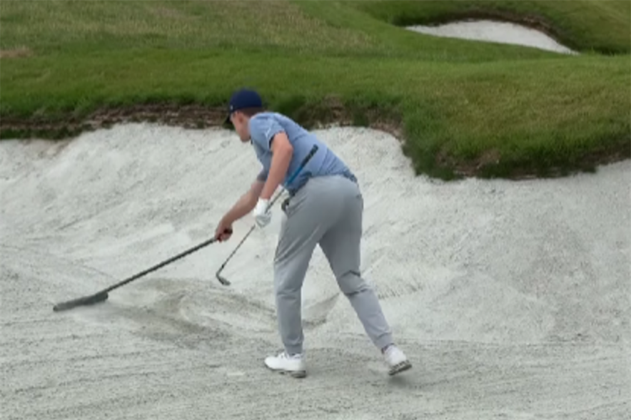 Ook deze golfer heeft zijn vrouw of vriendin meegenomen naar de baan. Het gaat in dit geval om een heuze gender reveal. De verwachting is dan blauwe of roze rook, maar het wordt een slice.