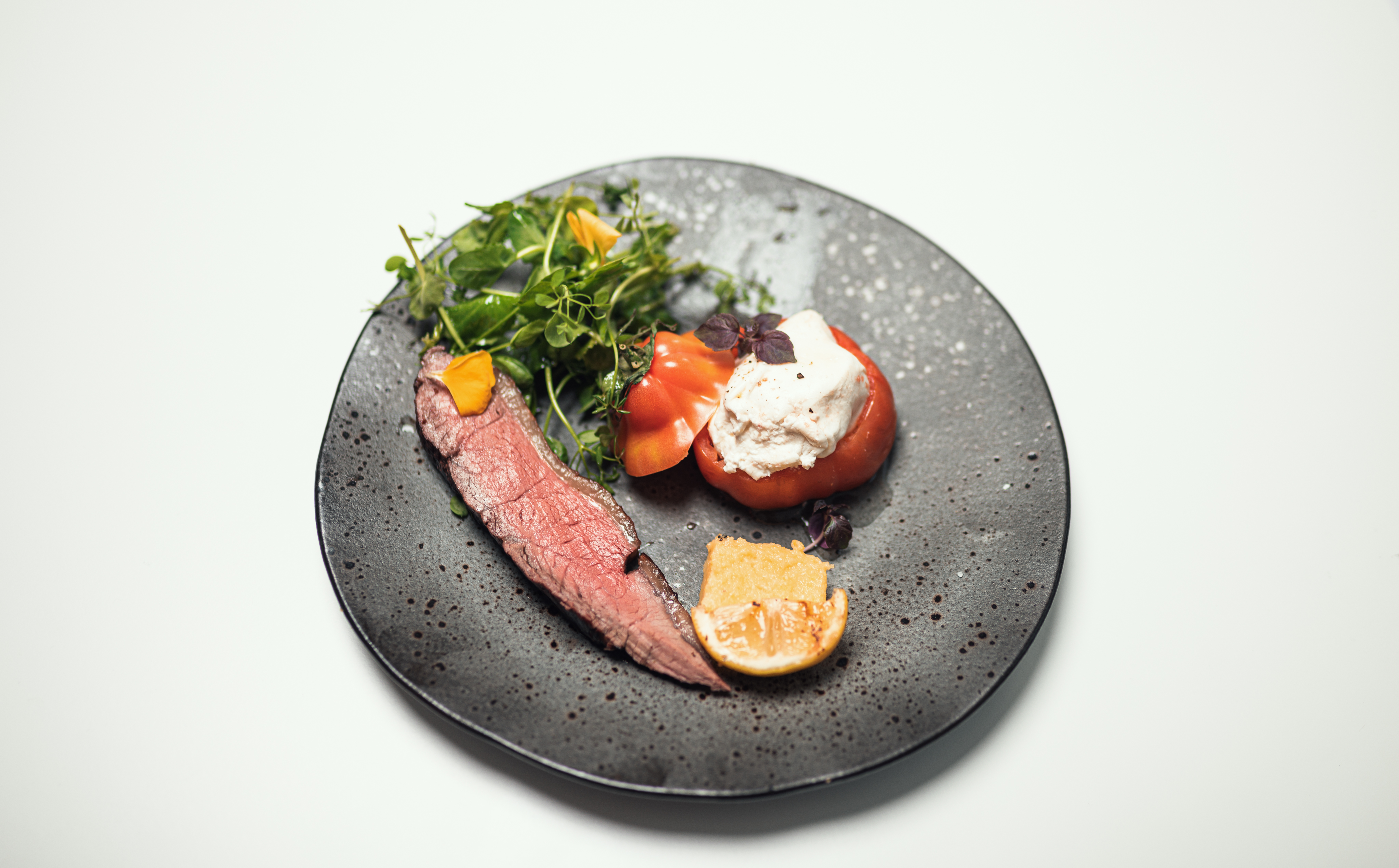 Coeur de boeuf met gerookte burrata, polenta en picanha