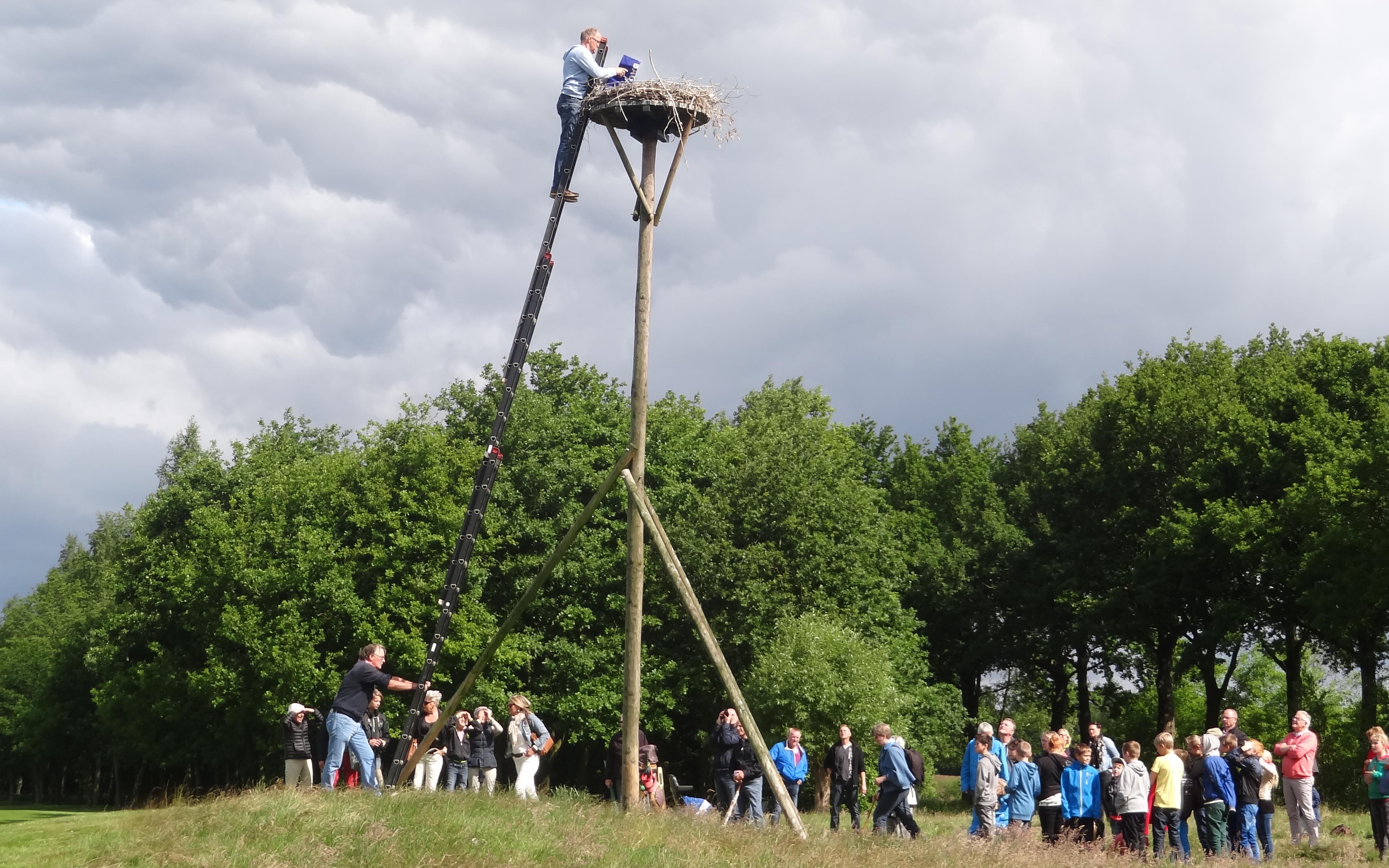 De Gelpenberg had in het seizoen 2015 drie ooievaars op een nest. Bij het ringen waren basisschoolkinderen aanwezig.